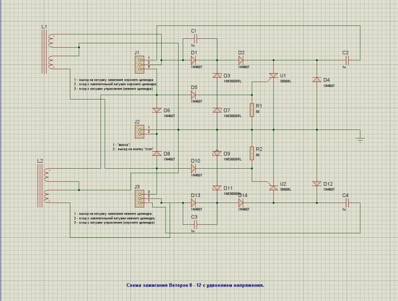 Стал водомоторником 3 года назад и первым двигателем был "Ветерок8Э". Довел его до ума (Огромное спасибо всем)! Но вот зажигание стандартное мягко говоря не очень в силу ряда всем известных причин (не бывает одинаковых тиристоров, разность зазоров в магнитной системе и т.д.) при этом не синхронность момента зажигания по цилиндрам доходит до 7-10гр. Даже если уда ется подобрать тирики при комнатной температуре, то при +60 они всеравно разные. Я смотрел схемы на форуме но мне они не понравились по ряду причин. Вот моя схемка на ваш суд. Схема пригодна для любых ДВС с поворотным основанием. Испытана длительными опытами на столе, а потом на ветерке8 и 12, проблем не было. Кого заинтересует всем отвечу. Завтра выложу фото готового изделия.