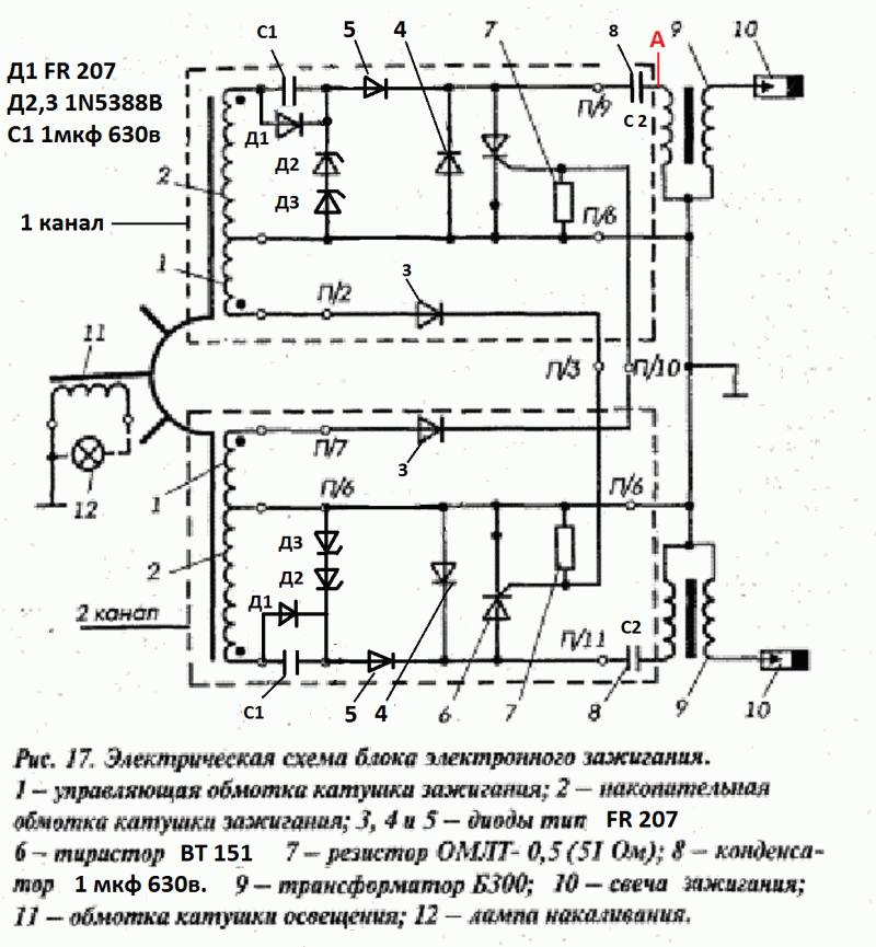 Устойчивое И.О. начинается с 90 об.мин против 150-170 у "типовой"Это облегчает запуск. Длительность искры составляет 0,4мс у типовой не превышает0,1.За счет применения мостовой схемы (у типовой однополупериодная и не иначе, особенность схемы) энергия зарядных катушек используется с мах. кпд. Т.О. за счет увеличения длительности искры(совокупности переходных процессов в контуре и длительности упр.импульса),а также увеличенной запасенной энергии в емкости, значительно увеличивается энергия искры.