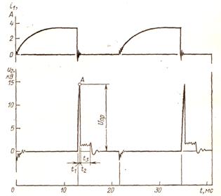 t1 — время нарастания вторичного напряжения до момента яробоя, t2 — время емкостного разряда, t3 — время индуктивного разряда