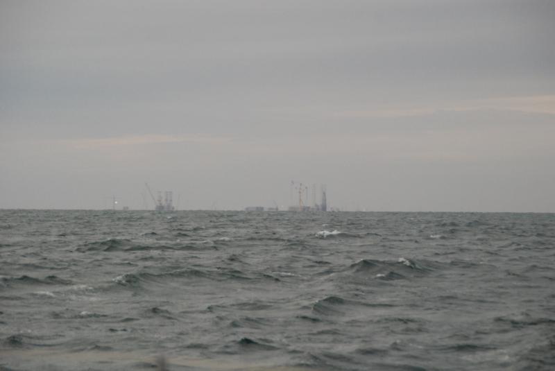Ближе к вечеру поднимается ветерок, северо-северо-восток и начинает потихоньку усиливаться, барометр начинает потихоньку падать, подтверждая мои подозрения на счет синоптиков. Ветер нам строго попутный т.е. фордевинд, что совсем даже не есть гуд, вопреки распространенному мнению, людей далеких от парусного дела. Хуже этого только мордотык, поэтому решаем паруса не ставить, по прежнему идем на моторе. И вот … УРА! На горизонте появляется торчащая из воды ржавая нога буровой. Делаем круг почета эхолотом меряем глубину. Грунт - 42м, над палубой - 35м, там где газит сифон, под кормой буровой - 60м. Над палубой график скачет, там нагромождение конструкций, жилблок, сломанные ноги, стрелы подъемных кранов. Газ поднимается из толщи воды тремя красивыми столбами пузырьков, у поверхности метров по 10 в диаметре каждый.