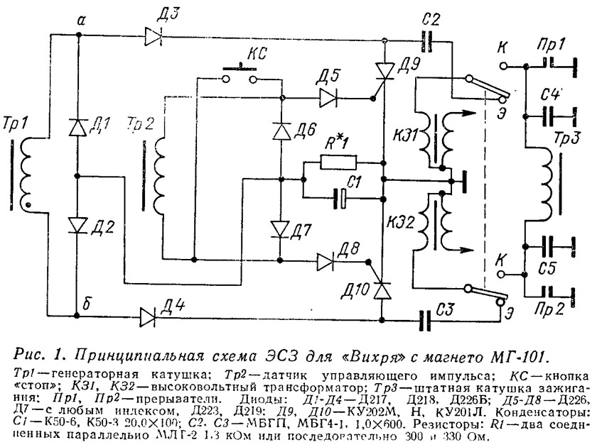 все бы хорошо, но чтобы тиристор открылся, ток должен течь с управляющего электрода на катод. выше я привел схему мг101, там перед управляющими электродами стоят диоды. кроме того на С1 напряжение порядка 300в, причем на левой обкладке минус, а на корпусе плюс. чтобы ток управления пошел через С1 катушка управления должна создать большее напряжение.Отрицательный полупериод открывает тиристор.