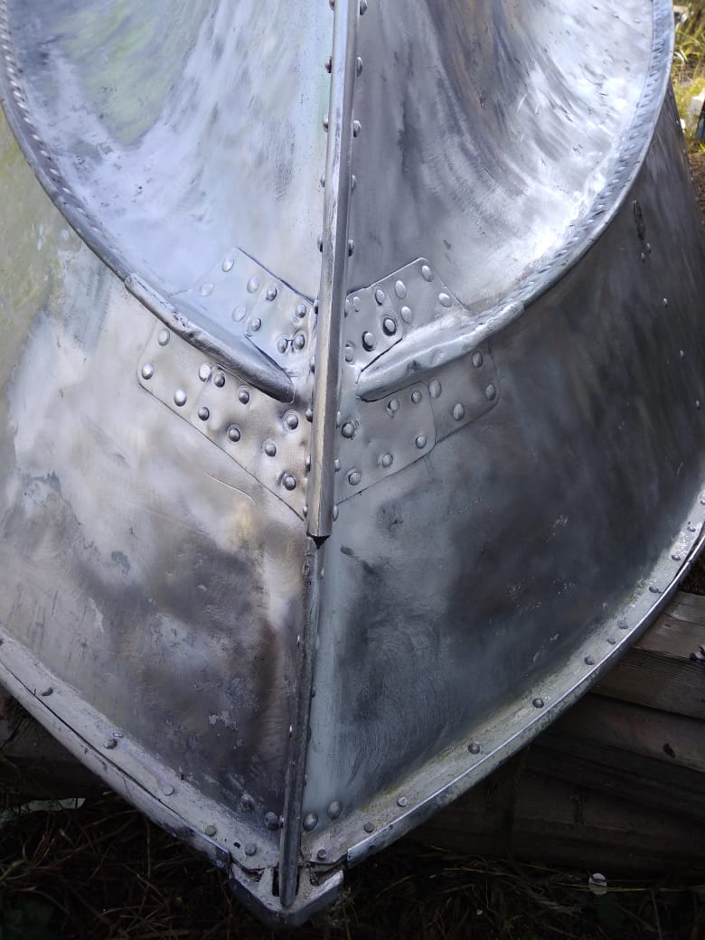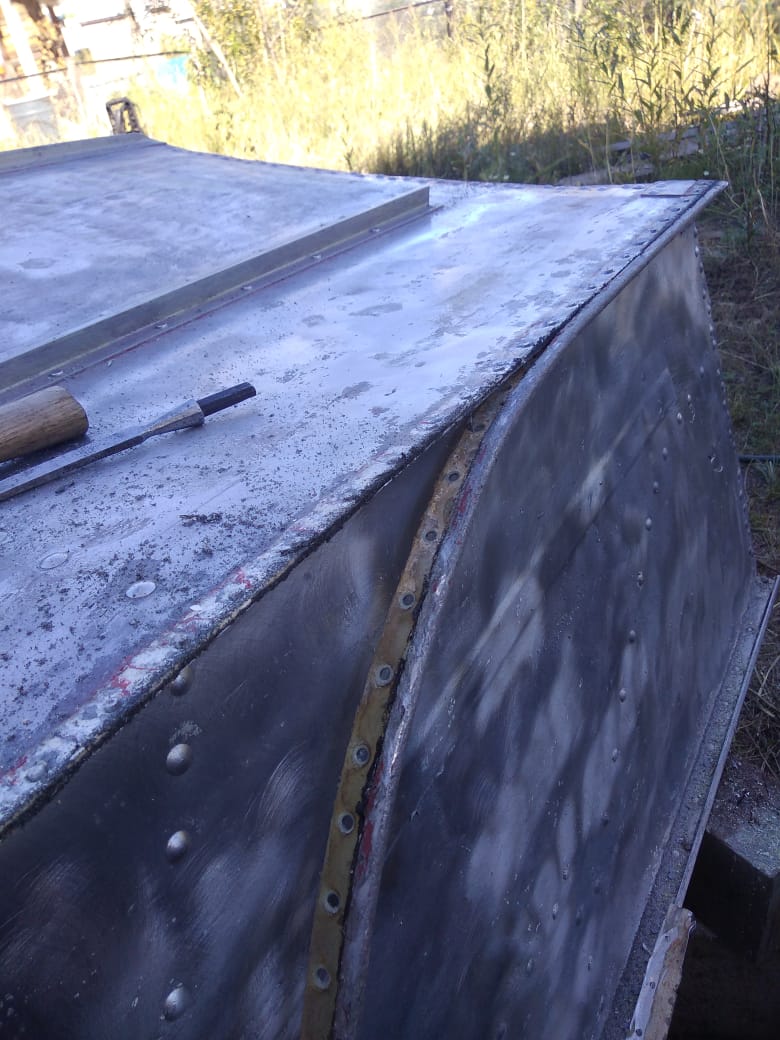 Скулы клепать было проще. Также обезжирив, нанес герметик, все операции схожи, только на этот раз с обратной стороны ставил не болванку, а молоток.