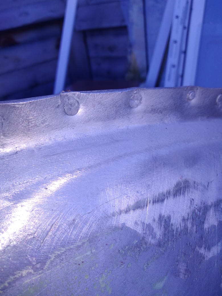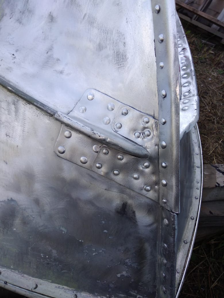 Заклепав накладки, я нанес герметик на заготовку и в места стыков скул с форштевнем. Установил заготовку по месту, фиксируя теми же болтами. И начал клепать. Сначала хорошенько обстукиваешь место, где собираешься ставить клепку, прямо чувствуется по звуку, когда зазор уходит. Затем сверлишь, убираешь стружку, смазываешь клепку, вставляешь ее, со стороны головки перфоратор, с другой – болванка из под шестигранника с углублением,… 2 секунты и заклёпано! Причем с обоих сторон полукруглые головки. Но следующую клепку ставил с другой стороны форштевня. Получилось в итоге, что клепки стоят в шахматном порядке. Клепки использовал д5 дюралевые д16, их тоже не надо отжигать.