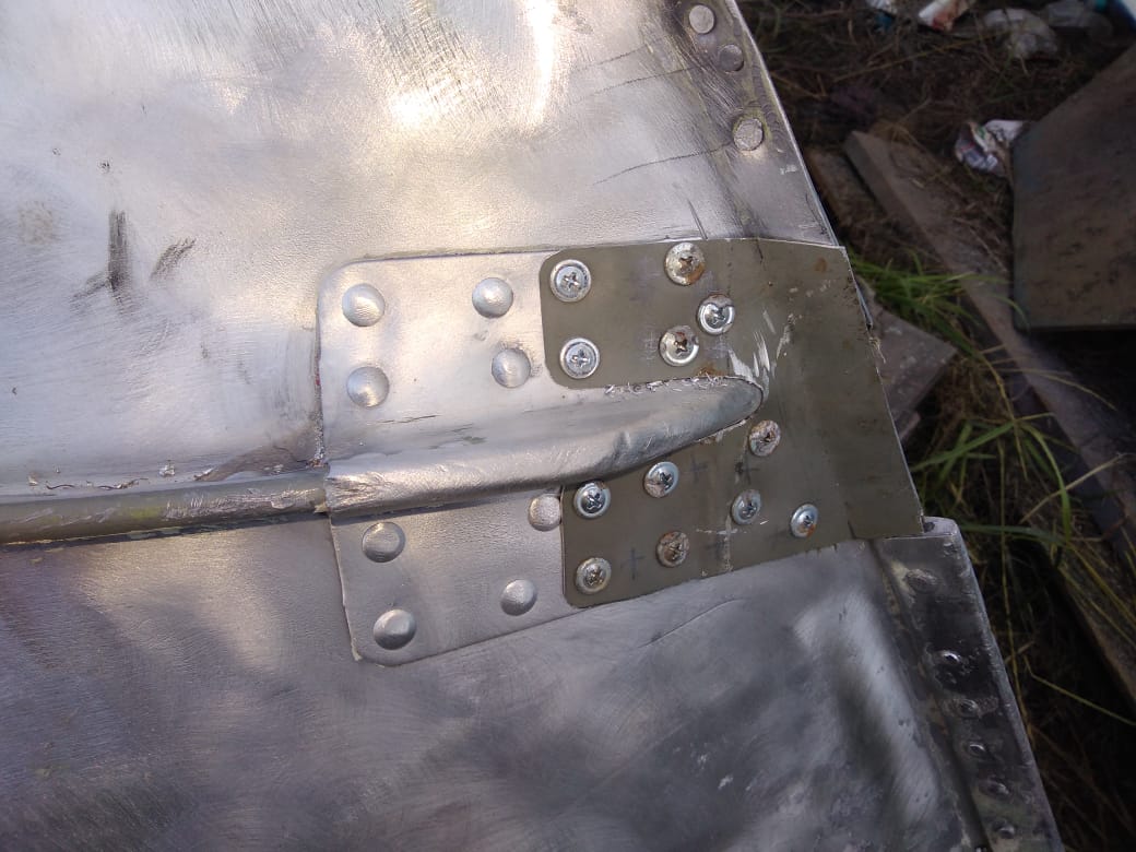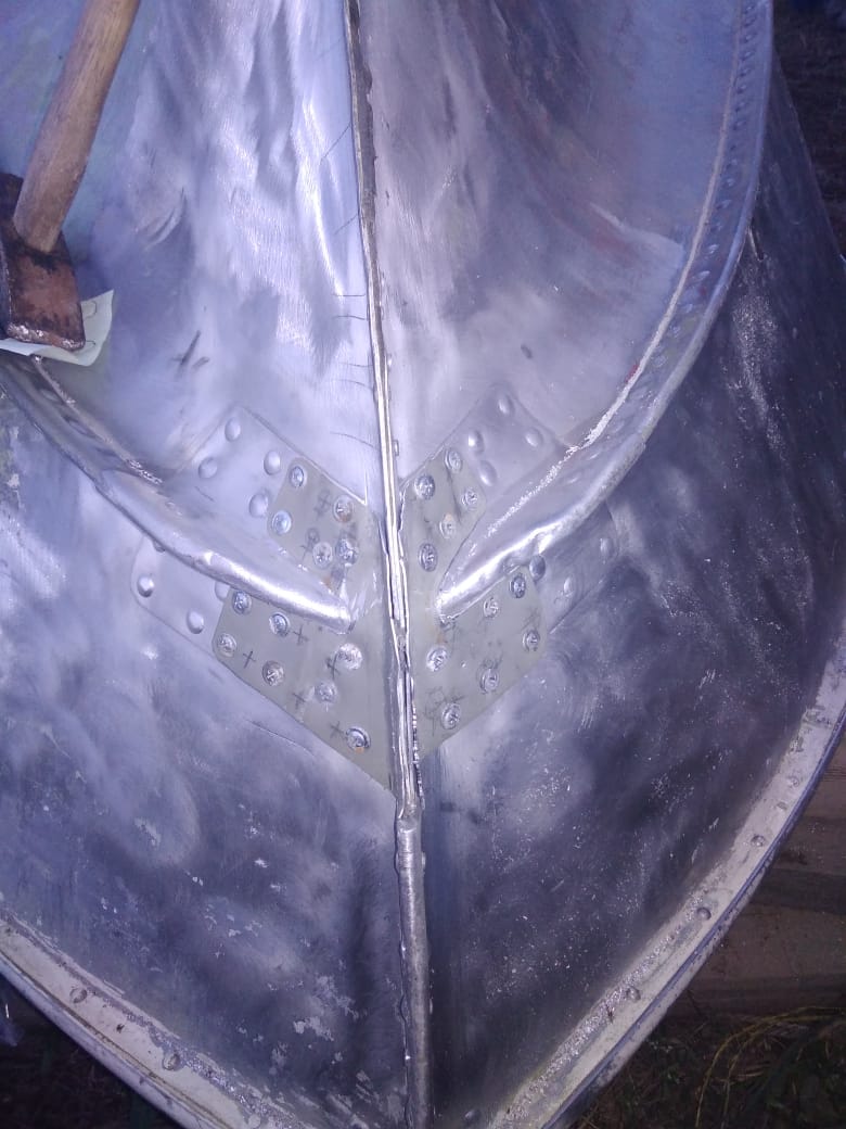 Теперь я занялся изготовлением накладок на стык скул и форштевня, т.к. старые лопнувшие я подрезал в прошлом году. Заготовки я вырезал из снятых в кокпите под рецессом листов, поддерживающих пенопласт плавучести. Сначала я поставил их на саморезы со сверлом, подогнал их по размеру, снял, обезжирил всё, нанес герметик и установил их на место опять же на саморезы. Затем, убирая по одному саморезу, рассверливал отверстия под заклепку и, макая клепки в герметик, заклепал накладки. Использовал полнотелые клепки д4 марки Д16. Эти клепки не требуют отжига и хорошо плющатся.