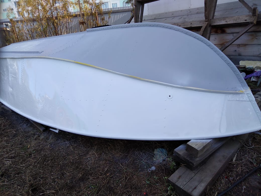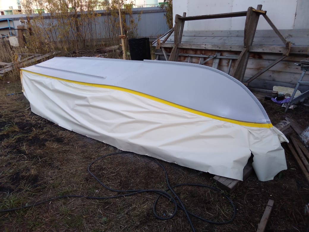 Дальше пришлось сушить лодку аж полдня, практически до вечера, чтобы краска высохла на столько, чтобы на нее можно было наклеить бумагу. Как оказалось позже – сушить надо было бы еще дольше. НО! Выходные заканчивались, завтра на работу, причем после работы у меня только час светлого времени, да и на завтра – последний «теплый день» по прогнозу – дальше дожди и минус. Так что надо успевать «кровь из носу».