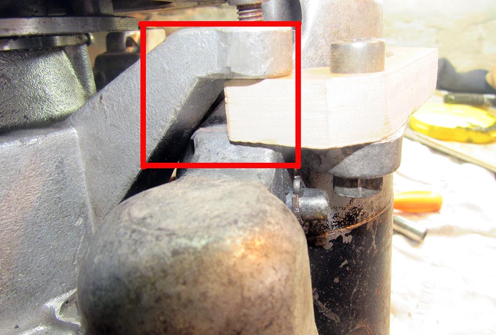 Появился ещё один пропил под ногу ручного стартера, думаю не критично, эт на макете я размахнулся...на самом деле можно всё более корректно сделать, ещё обнаружилось следующее, не очень хорошо расположено отверстие над втягивающим..пришлось расшарошить..и как факт принять , что там придется ставить либо шпильку..либо как-то резать резьбу, что не есть хорошо (собираюсь кронштейн делать с дюраля) либо делать потай под головку болта..поскольку снизу кронштейн вплотную к корпусу втягивающего..