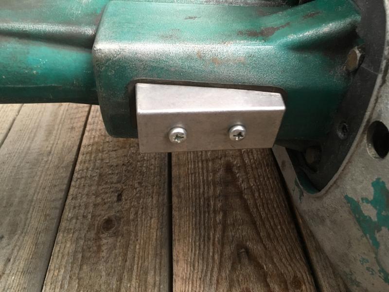 В ноге примерно в 5 см ниже поддона провернул 2 отверстия по 8 мм рядом, по горизонтали, так, чтобы они попали в верхнюю камеру глушителя. Нога не идеально ровная в этом месте, так что напильником выбрал немного радиус в торцевых стенках глушителя, чтоб подогнать. Ну там дырки под крепежные болты прокрутил, резьбу нарезал - тут все понятно. Взял кусок резины от камеры какой-то, прокладку вырезал и все скрутил. Только под болты сделал еще проставки, чтобы поверхность не прогнулась при затяжке.