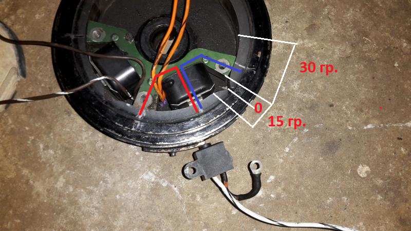 По этому путь только один. Накопительную катушку и датчик надо двигать одновременно за маховиком что бы не происходило выброса импульса в момент открытия тиристора. То есть расположение сердечников накопительной катушки должно быть строго вот такое как на твоем фото, но при этом угол маховика а значит и поршня должен соответствовать 15-17 градусам раннего.