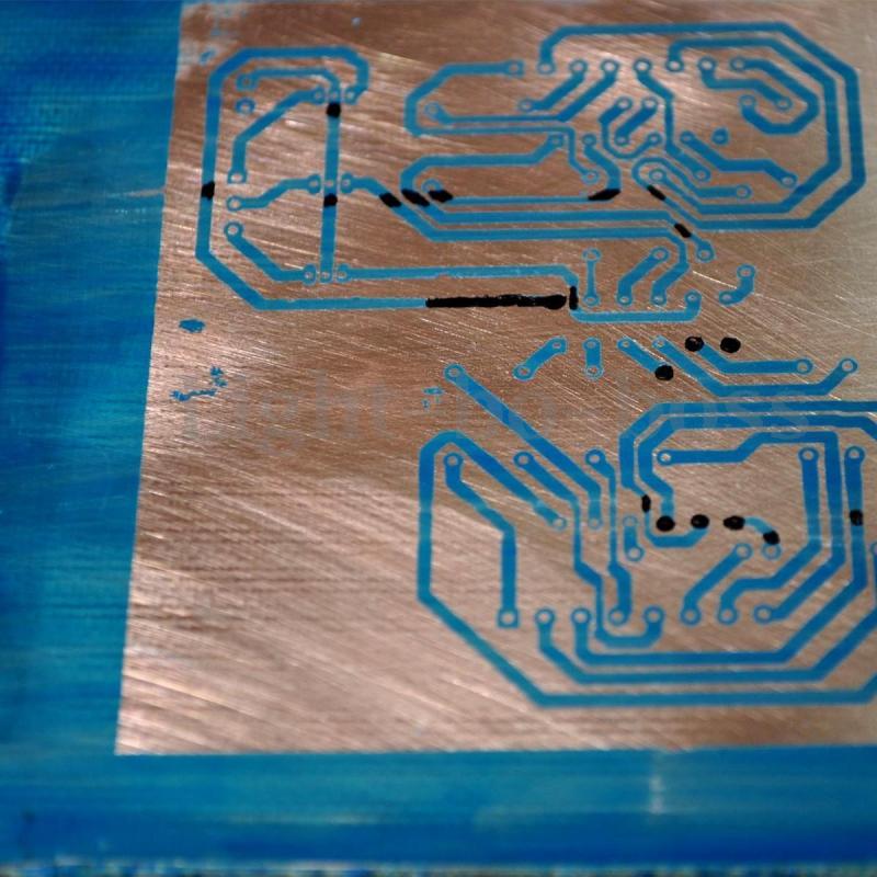 Самый лучший - китайский. При засвечивании становится от темносинего до фиолетового, (смотря от времени выдержки) держится очень прочно, и при травлении не разбухает. МПФ-ВЩ требует большей выдержки, держится очень хорошо, после экспозиции, рисунок просматривается немного, но не так как на китайском. При травлении немного разбухает. И последний ПФ-ВЩ-50 Сразу скажу, что скорее всего больше для нужд радиоэлектроники его использовать не буду. После экспозиции (возможно, требуется времени больше чем на предыдущие) рисунка практически не видно совсем. Пробовал и на солнце, китайский после такой выдержки, оказался слишком засвеченный, и в некоторых местах между дорожками не вымывался содовым раствором. Но самое мерзкое его свойство, оказалось - разбухание, и частичное отслаивание. И при разбухании затягиваются некоторые отверстия и не протравливаются. А также увеличивается ширина дорожек, ну и соответственно уменьшается клиренс. И по закону подлости больше всего там, где это критично. Хотя внешне дорожки выглядят ровненько, как будто было так и задумано. Травил пока только хлорным железом, причем старым раствором, часа по два уходило на плату. Без подогрева, при комнатной температуре. Может свежий раствор, да еще с подогревом, не дали бы такого эффекта. Но свежего не было, ехать покупать было лень. Вот, закончу, разработку еще одного устройства, проверю как будет действовать перекись с лимонной кислотой на все это дело. А может после проявки дорожки феном прогревать, чтобы лучше задубились?