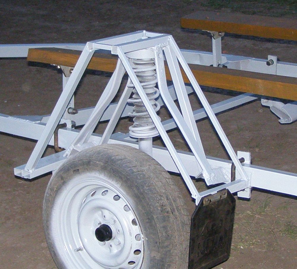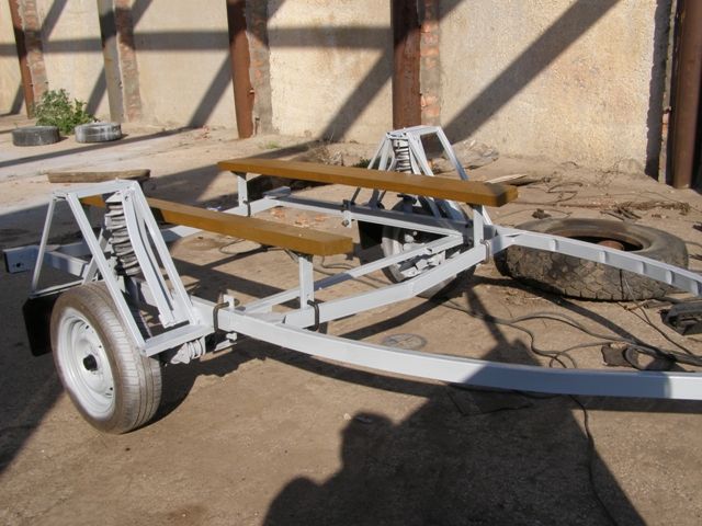 Балку разрезал посередине, ступицы взял тоже новые. Получилась независимая подвеска .Стремянки от газели. Лебедки такие продают 1200р, 3 отбойника желтых стоят копейки, они для упора носовой части. 7-дней конструкцию собирал один. Те, кто проходя мимо смеялся, в конце всех работ были приятно удивлены. Перевозить лодку одно удовольствие, ее не трясет, прицеп идет ровно. Не учитывая свой труд все обошлось в 7-9 тыс. Все что получилось можно увидеть на фото.