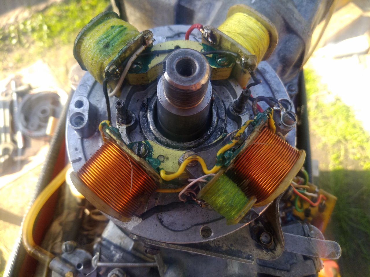 Спасибо! Все сделал по рекомендациям - искра появилась. Жирная, в нужном месте, двигатель завелся, но... Оборотов не набирает, метка бегает по всему маховику, только на малых оборотах можно рассмотреть.