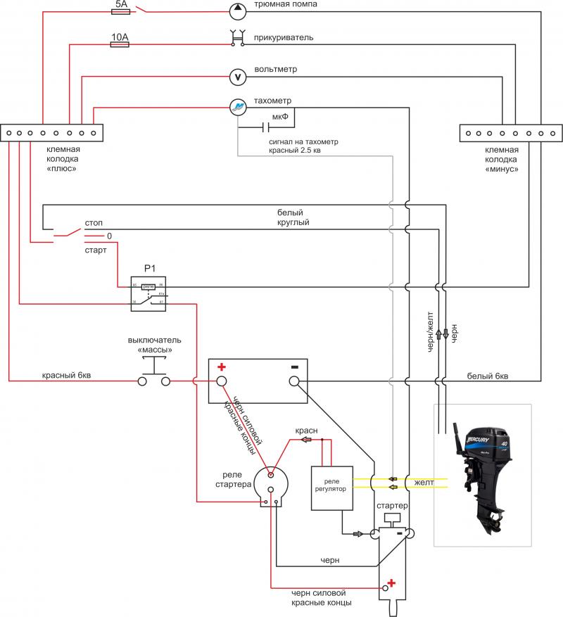 Вот прикладываю схему разводки проводов по моей лодке. Глупость конечно, но все же спрошу: Может ли быть проблема в минусовом проводе, который я протащил со стартера до тахометра (с ним в жгуте идет сигнальный провод на тах)? И нужно ли было его тащить со стартера или можно было запитаться от минусовой клемной колодки, которая находится в полуметре от тахометра.