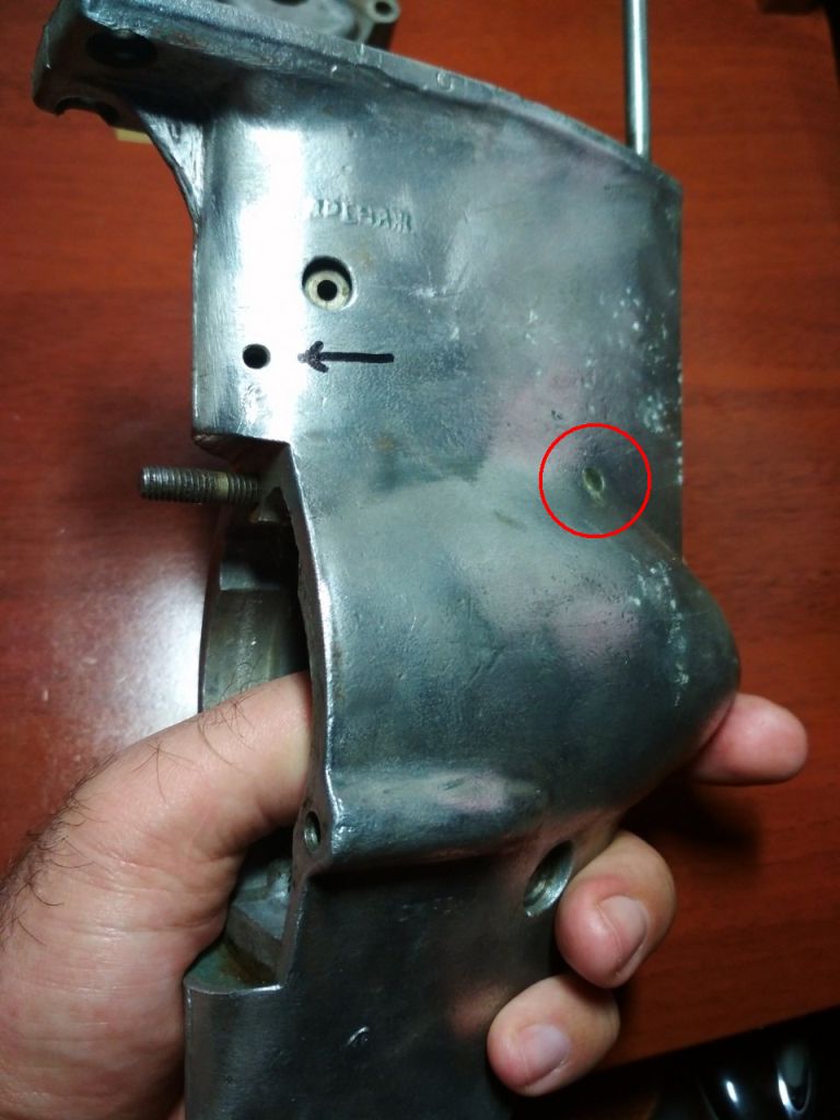 Это отверстие, как и обведенное красным, служит для слива воды из полости дейдвуда после покатушек. Эти отверстия находятся в нижних точках полости, когда ставишь мотор вертикально - оттуда вытекает вода с копотью и маслом от выхлопа.