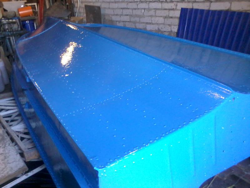 4. Покрыл кислотным грунтом лодку, через пятнадцать минут начал покрывать грунтом. Работал кисточкой, так как валик оказался твердоват и не прокрашивал около заклёпок. Закончил около 11 вечера, отправился спать.