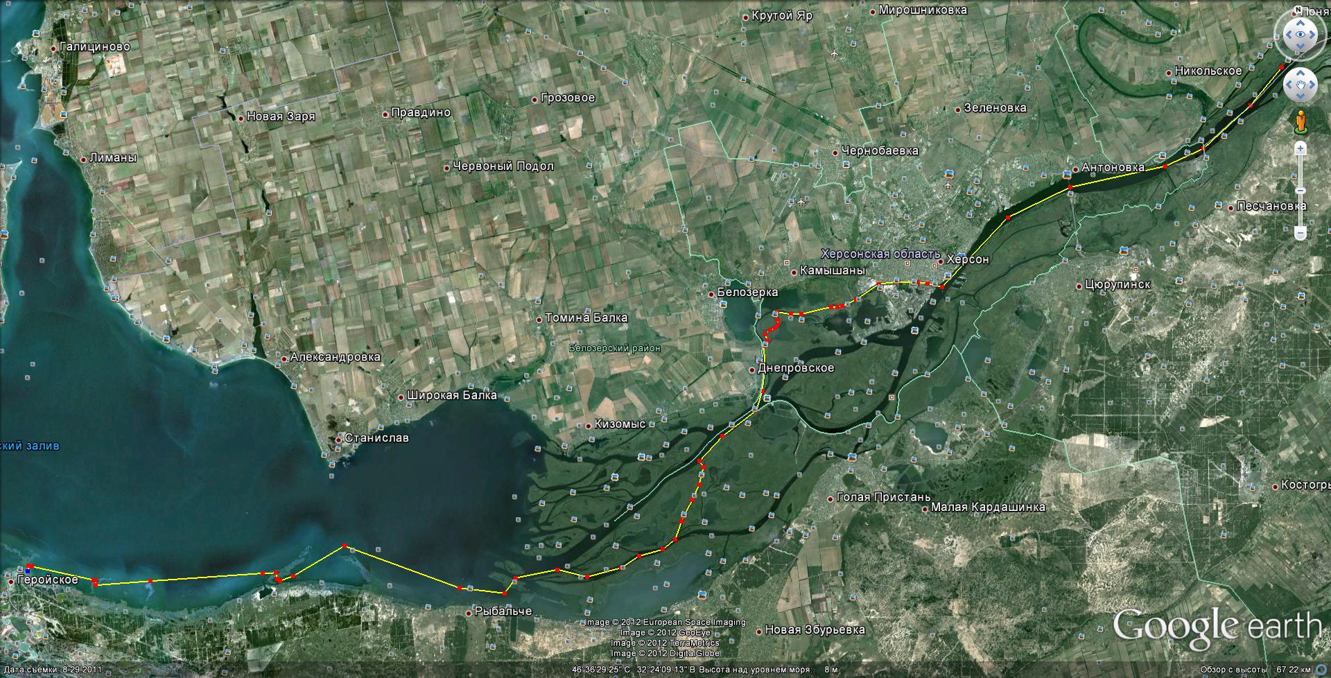Наш путь до Геройского нанёс на гугловскую карту. Петляли из-за ветра, сильно задул Юго-Запад. Жались к северной части Кинбурнского полуострова. Там мелко, камышовые берега, но если брать из Конки между островами Малый Соколин и Гадючая Коса, оставляя остров Тендер слева, идти вдоль Аджигольских маяков (мы мимо них и шли), то метр-полтора глубины имеется. Дважды влетали в браконьерские сети, честные сети обозначены флажками и к ним бутылки пластиковые привязаны, их видно. А потом мимо острова Янушев, островов Вербки, острова Тендра (да, два острова в тех краях с похожими названиями - Тендра и Тендер) прямо до Геройского. И обратно по тому же пути.