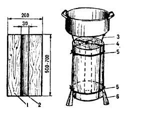 «Дровяной примус» (рис. 30) изготавливают из сухого чурбака, расколотого пополам. В обеих половинках вырубают желобки. После этого половинки плотно стягивают проволокой (сбивают гвоздями), исключая подсос воздуха с боков. Проволочными стяжками одновременно крепят ножки. «Примус» разжигается снизу с использованием сухих щепочек. Варочная посуда устанавливается на вбитые большие гвозди или подвешивается на тросике.