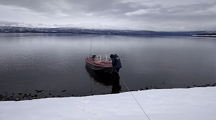 На берегу поговорили с другими рыбаками - на троллинг ловится. Видно ушла на глубину. Зато утром был экстрим. На воде туман, как молоко. От берега отошли метров на 200 всего и нашего берега уже не видно. А до противоположного (куда нам надо было) - 5 километров с гаком. Ну а вправо и влево и вовсе. Там и без тумана берегов не видать. Так и шли 5 км. по приборам. Эхолот глубину показывал, друган по компасу в телефоне направление указывал. Но в моём телефоне простой Яндекс-навигатор отлично справился. Я по нему и шёл. В конечной точке, когда увидели очертания берега, поняли - промах всего метров 100.