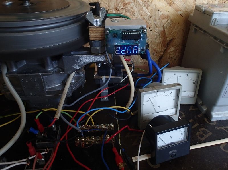 Вот теперь как будет меняться зарядный ток при дальнейшем увеличении оборотов? Что-то подсказывает мне что не очень-то сильно возрастёт. Проверить получится только на воде, поставив в цепь заряда амперметр. И ещё вопрос как поведёт себя каммутатор при увеличении оборотов? Точнее средний ток потребления при высоких оборотах. И тут вспомнил, что есть у меня маховик с установленной на него "шторкой-обманкой" с 6-ю выступами вместо двух(только для проверки тахометров и зажиганий на микроконтроллере), что позволяет как бы поднять в три раза вместо реальной частоту вращения. Мощность генератора конечно же останется прежней, даже хуже, т.к. это маховик от МБ-2, из за выступов на башмаках.