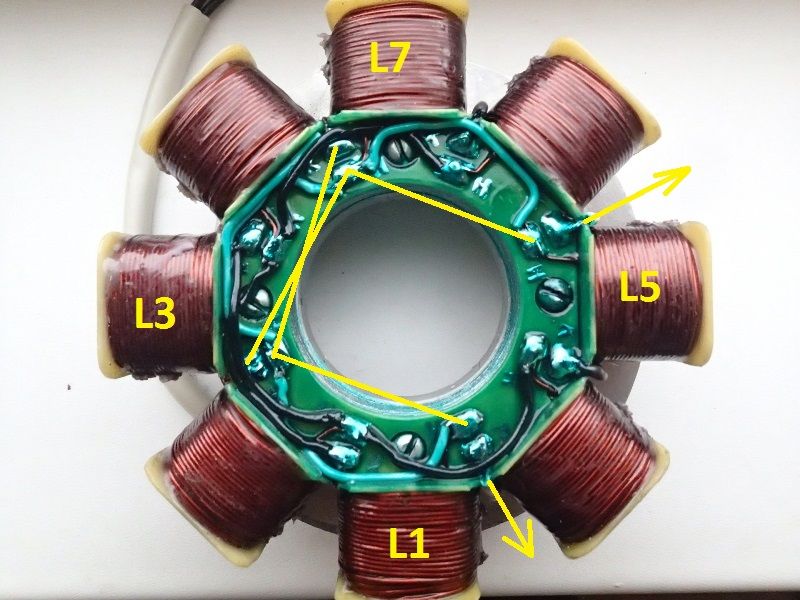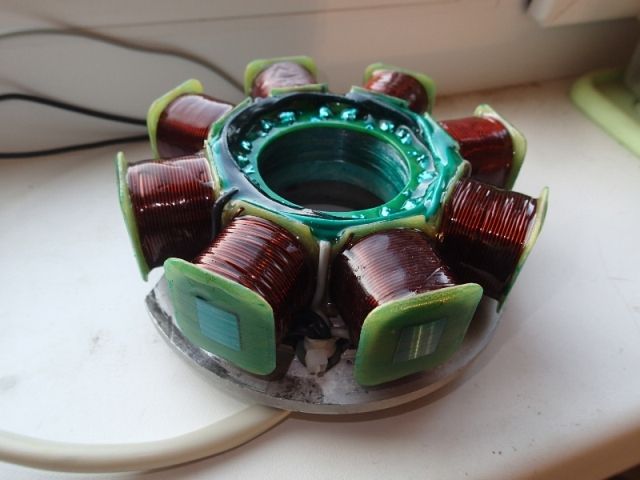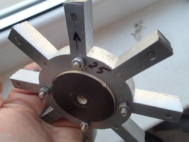 Условия те же, что и при испытании первого генератора за исключением маховика. Хотя на "ощупь" магниты сильные на обоих. С одним маховиком даёт 4А тока, а с другим 5А при 2500 об/мин......