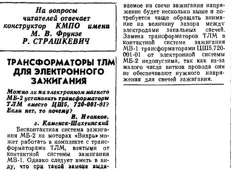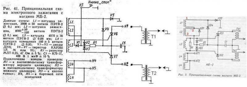 Схема подключения в/в трансформаторов на этом рисунке (№ 3) неправильное. В книге Страшкевича на стр. 69, рис. 41, в схеме МБ-2, в/в тр-ры подключаются к выводам Н1 и Н2 (трансформаторы "дорисованы"). Это всё к тому, что на "Мотолодке" предлагается подключать тахометр к низковольтной обмотке одного из в/в тр-в (на "Ветерке" тоже двухканальная ЭСЗ).http://forum.motolodka.ru/read.php?f=1& ... aly_352575 (читать пост ниже фото). Вопрос: какие обороты показывает тахометр, реальные 690, или заниженные в два раза, т.е. по факту должно быть 1380 ? :?
