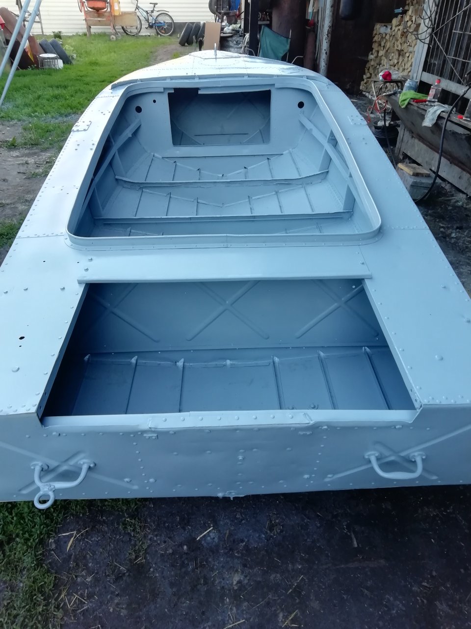 Ну в общем докрасил я лодку, внутрянку без грунта по старой краске, наружу кислотник и через 40 минут индосингл пу дтм 20 в 2 слоя, он идёт как промышенная грунт эмаль, матовый серый. Крупные риски от жёсткой крацовки не перекрыла всё таки. Борта палубы обдирал пром феном, там всё гладко и красиво, знал бы всю бы феном очищал.
