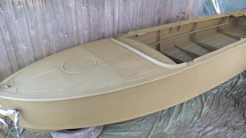 Фото процесса нет, т.к. я отсутствовал. Процесс нанесения краски от грунта не отличался. Погода баловала теплом и почти безветрием, так что уложились в 4 дня. Грунт и краска сохнут очень быстро, на отлип около получаса. Так что под вечер лодка спокойно грузилась на прицеп и убиралась в гараж. Полиуретан ложится и липнет очень хорошо, даже начинающий может обойтись без подтёков.