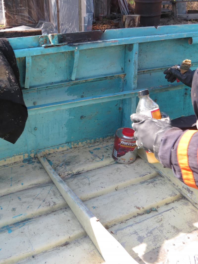 На третий день нанесли краску по той же схеме на днище и борта, на четвёртый день на верх.