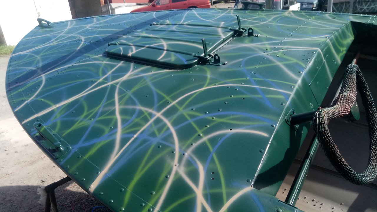 Затем скочбрайт , с очень маленьким зерном, набил легкую риску , смел всю пыль, помыл всю лодку, ( вокруг лодки налил воды дабы не было пыли при покраске от земли) , обезжирил 647и стал красить этим же пульвом нанося базовую краску Vika 2k 607 ( зеленый сад) это база лодки . Ушла банка +200 гр. разливной. Мешал в пятилитровой бутылке сразу с отвердителем и растворителем проливая через авто-сеточки для краски. Пропорции взвешивалась на весах. Получил однородный готовый материал. Смотрите фото... Посмотреть вложение 144170Посмотреть вложение 144171Посмотреть вложение 144172Посмотреть вложение 144172Посмотреть вложение 144173