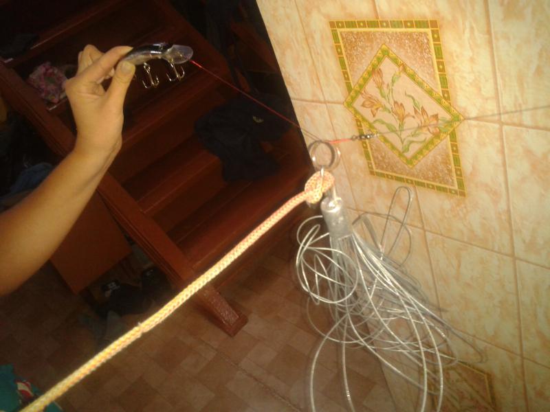 Покупать я его не стал, сделал самодельный. Взял алюмин.корпус от конденсатора старых ламп дневного света. В строймагазине купил 10 метров оцинкованного тросика сечением 1 мм. Тросик сложил петлями по 15-25 см. Взял гвоздь средней величины. С одной стороны сделал петлю, надев туда петли тросика. Просунул свободный конец гвоздя сквозь алюмин.цилиндрик. Сделал на втором конце гвоздя петлю для верёвки. Сюда же прицепил карабинчик-вертлюжок для зацепления к основной леске (шнуру) снасти.