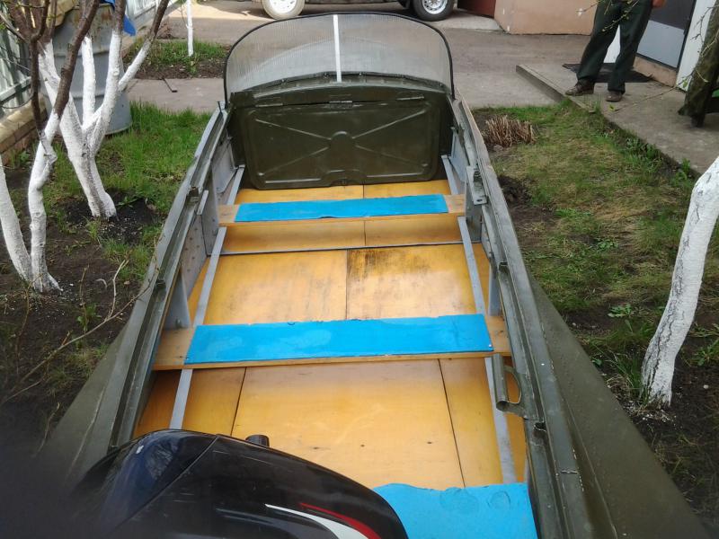 Вот наконец собрался показать свою лодку. Казанка-м. Брали с отцом в 2012 году весной. Состояние на 4+ но старой краски на днище слоев 8 было....оглох смывать. После смывки все по технологии: ВЛ2, 2 слоя грунта, 2 слоя Мобихела, внутри 1 сло1 грунта. Полностью заменены транцевые доски, скамейки, новые слани из фанеры 6ки, стекло из сотового поликарбаната. Делали для себя под рыбалку и охоту. Эксплуатировали весь 2012 год в окрестностях Чистополя. Сейчас стоит дома (нынче новый комплект взяли). Мотор Сузуки 15 2т.....ну как то так коротенько