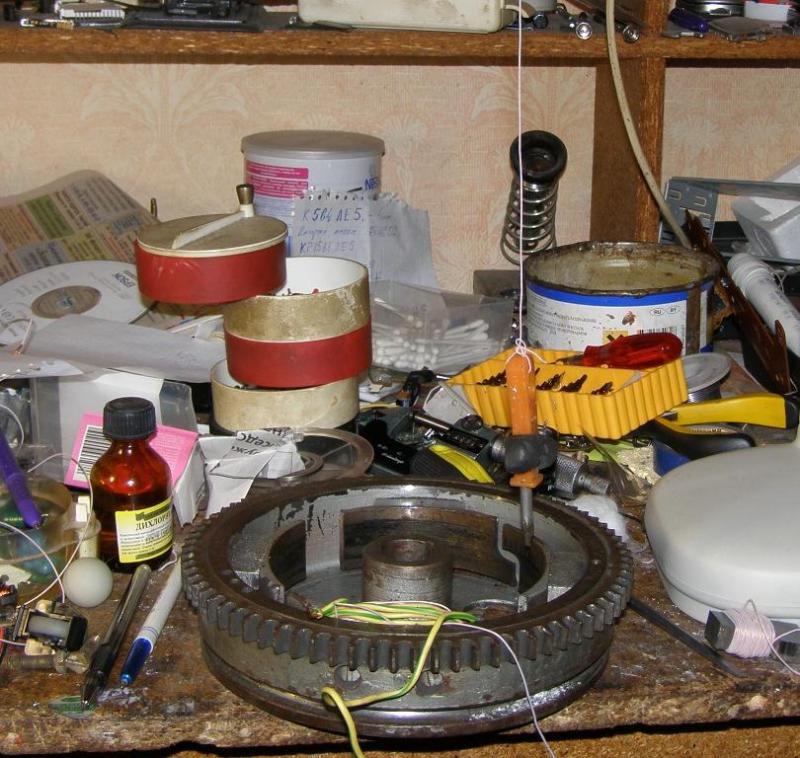Ложим маховик кверх ногами на лист фанеры, примагничиваем вертикально торцевой ключ от маховика