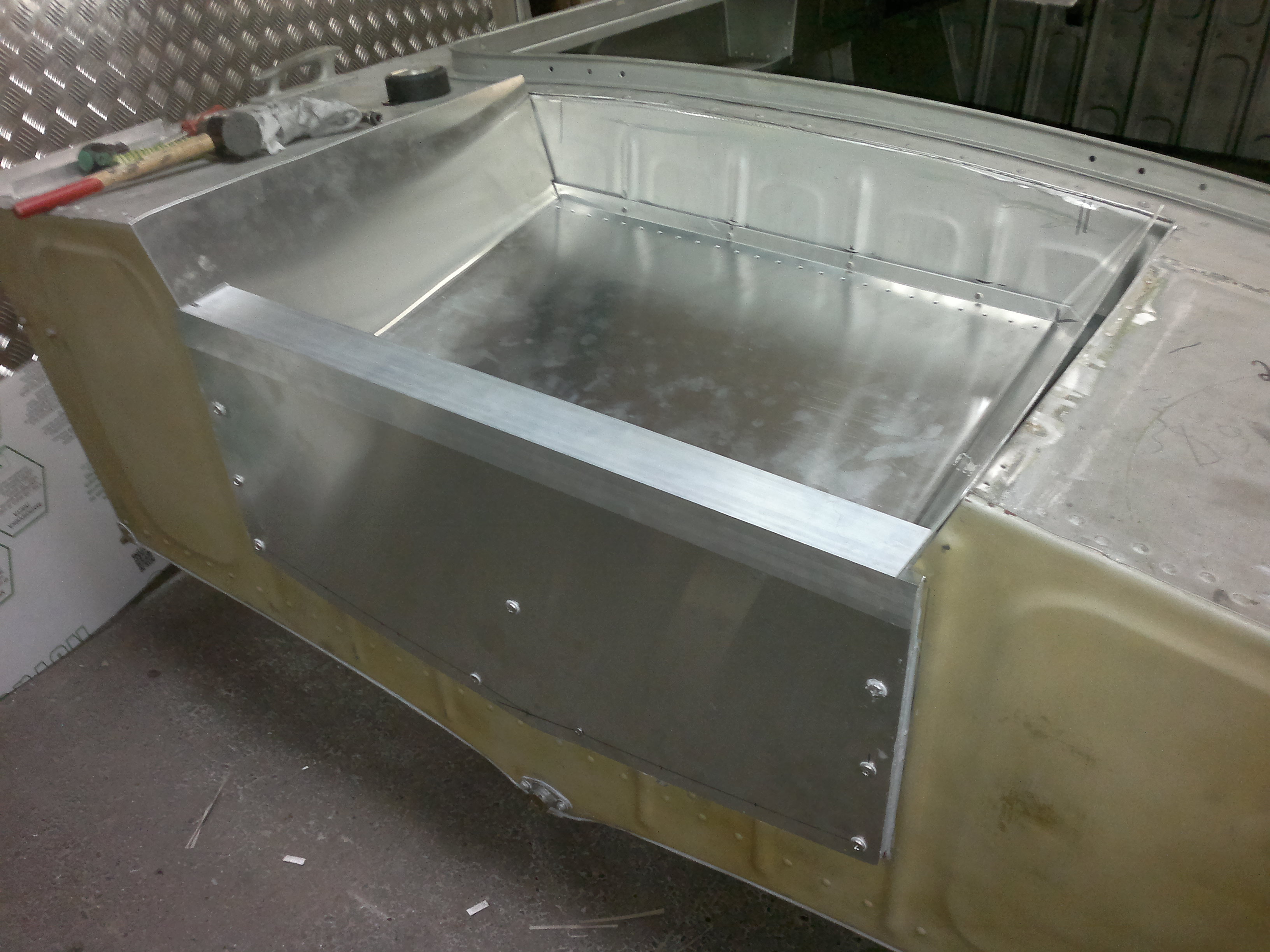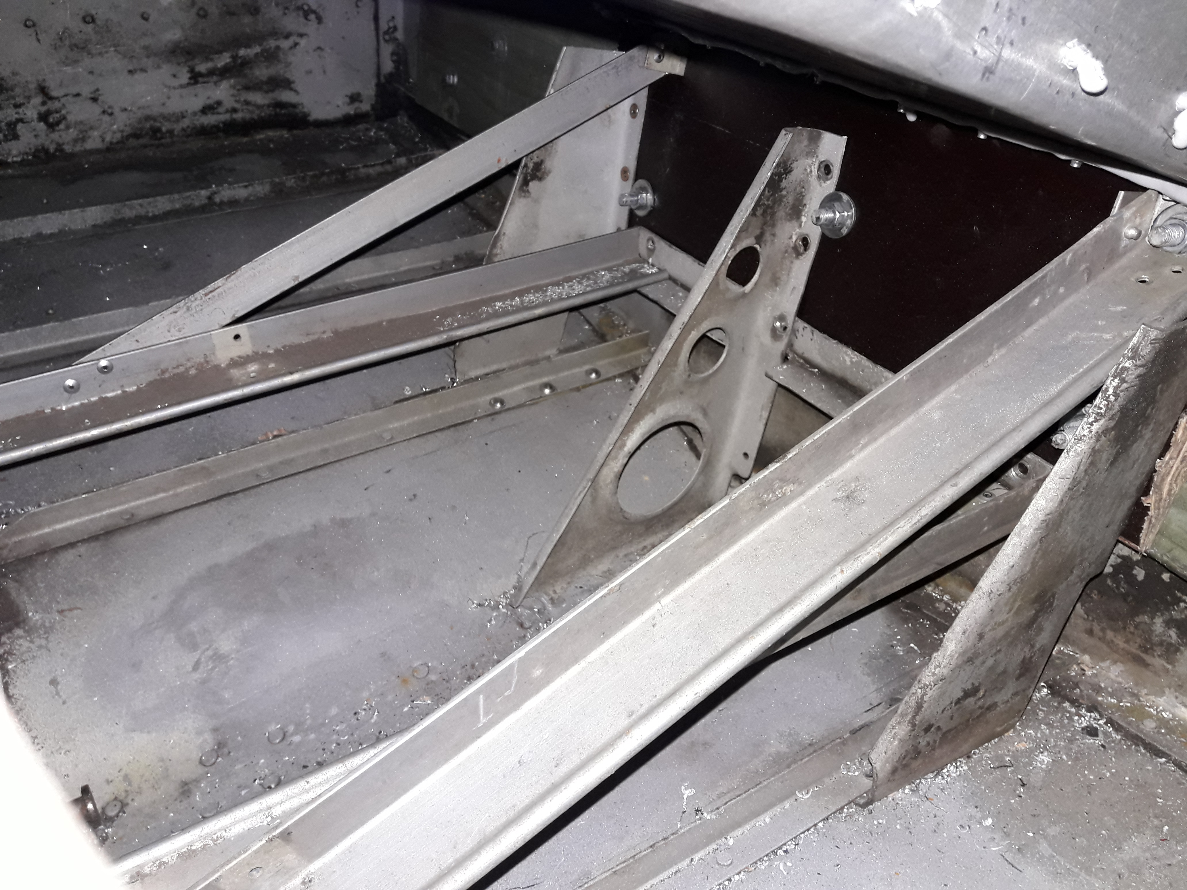 Суть косынки в том, что это треугольной лист, который распределяет нагрузку равномерно на грани, а не уголки с пустотой внутри треугольника. Его края должны быть загнуты или оклепаны уголком. У тебя нагрузка точечная и идет восновном на перегородку рецесса. Она никакая и работает как мембрана в данном случае. Глянь фото - Там все понятно. Косынки для наглядности на фото, Где днище лодки. И к черту вытяжные, если это не нержа. Их должно быть много, а не 2-3 по углам. В твоем случае они быстро развалятся. Это неправильный материал в неправильном месте с неправильным конструктивом.