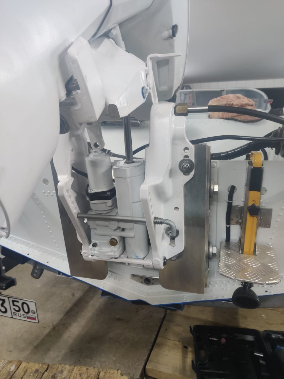 на современном ВЕОСЕ нет уха крепления гидроподъема, нужно менять поворотный механизм от ямахи ф 40бетс и тогда все хорошо встает. Правда в нынешних условиях это дорогое удовольствие.Разбавлю тишину. Вот так выглядит мой колхоз: 40 HEPO (1994) на подвесе от F40. Откидной кулак упилен, отверстие отфрезеровано под втулки, перенесена тавотница. Поворотный вал упилен и приварен к кронштейну. Щлицы не трогали, нет в Москве мастеров, которые готовы были бы взяться за нарезку шлицов. Струбцины, опора гидравлики и сама гидравлика от F40 без изменений. Все остальное, включая кронштейн нижней опоры от HEPO.