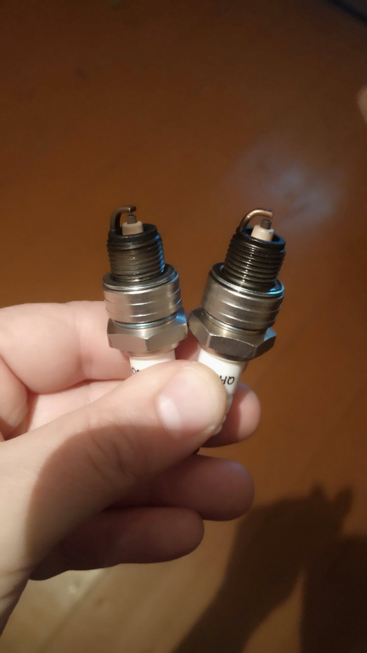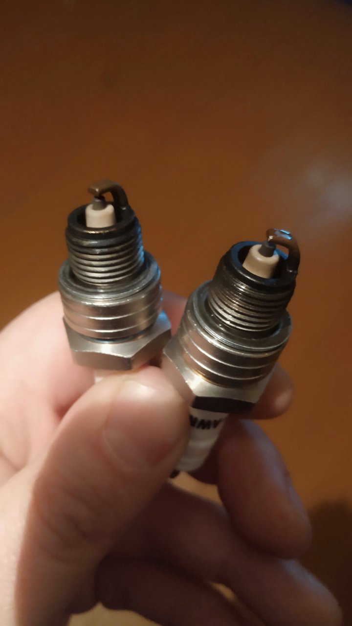 На первом фото левая нормальная. Что с правой - сказать затрудняюсь. Не видел такого. Возможно мощная и короткая искра на ней. Какой-то странно электрод выглядит. По идее такое может быть, если сопротивление колпачка повысить. Но в горшке тогда температурный режим поменяется, если с зажиганием не попал чуток, то и шатунам достанется.