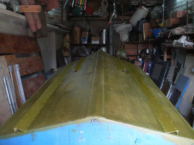 Делал шаблон из двух досок, прикидывал длину и ширину, чтоб заклёпки нормально вошли и по возможности не перекрывали те, которыми лист к продольному набору прибит. Как перевернет, посмотришь, сам поймёшь, что вариант практически один. Набор непараллелен килю и вообще ничему. Днище скорее всего тоже не имеет симметрии. На телеге ты этого не увидишь.