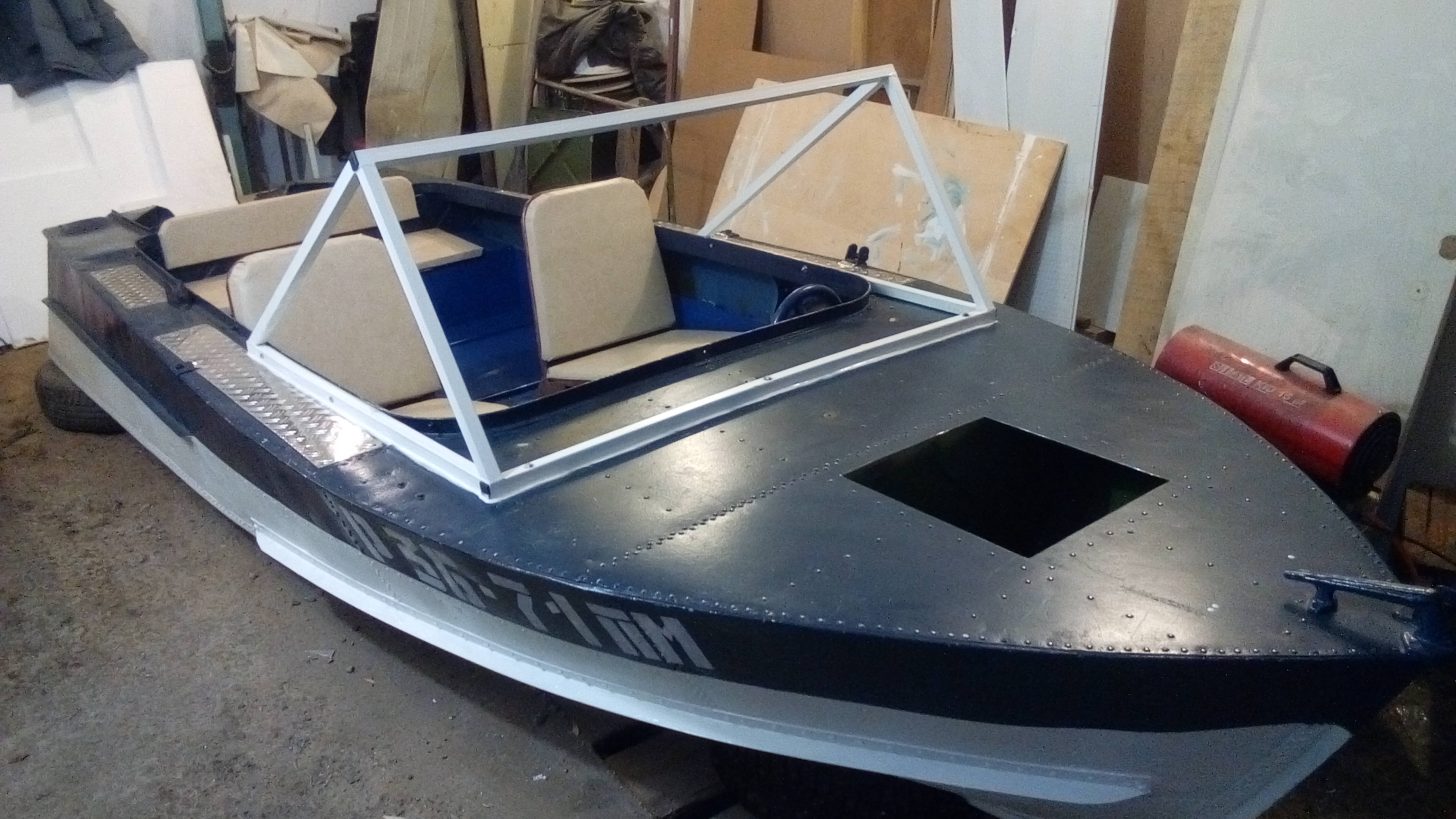 Приветствую всех ! С масленицей вас , братья по разуму ! Ну , уж с днём св. Валентина не поздравляю на то есть жёны и подруги , да и не наше это ... наносное ... ______________ Продолжаю рассказывать про свою МКМку . Закончил я с брызгоотбойниками и приступил к лобовухе . Прикинули , отрезали , сварили , покрасили . Только потом заметил , что с таким вылетом боковин нарисовалась проблемка с вёслами , но уж больно мне хотелось боковины подальше вынести , чтоб брызг меньше залетало , решили чуток сдвинуть уключины . Был на базе пластика и резины , присматривал поликарбонат , примерно в три т.р. встанет , по размеру вырежут . Прокрасил все деревяшки в лодке на два ( местами на три ) раза . Есть у меня пара сидушек прогрессовских , старую обшивку с них сдёрну и обтяну , как задний диванчик , ну и приборную панельку нормальную хочу сделать , а то первая уж больно не симпатичная вышла ...