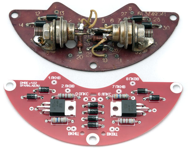 Так как ничего не бывает вечного, то было решено обновить его посредством переделки на импортные компоненты, благо информации на эту тему в интернете предостаточно. Единственное, вариант такого обновления с сохранением родной платы не устраивал качеством конечного результата, да и время над самой платой также неумолимо, поэтому было решено подойти к процессу обновления несколько иначе - с полной заменой платы и, возможно, проводки. Плату решено было разводить новую с возможностью подключения однополюсной кнопки "стоп". Родился нижеприведенный вариант (на фото он в сравнении с родной платой):