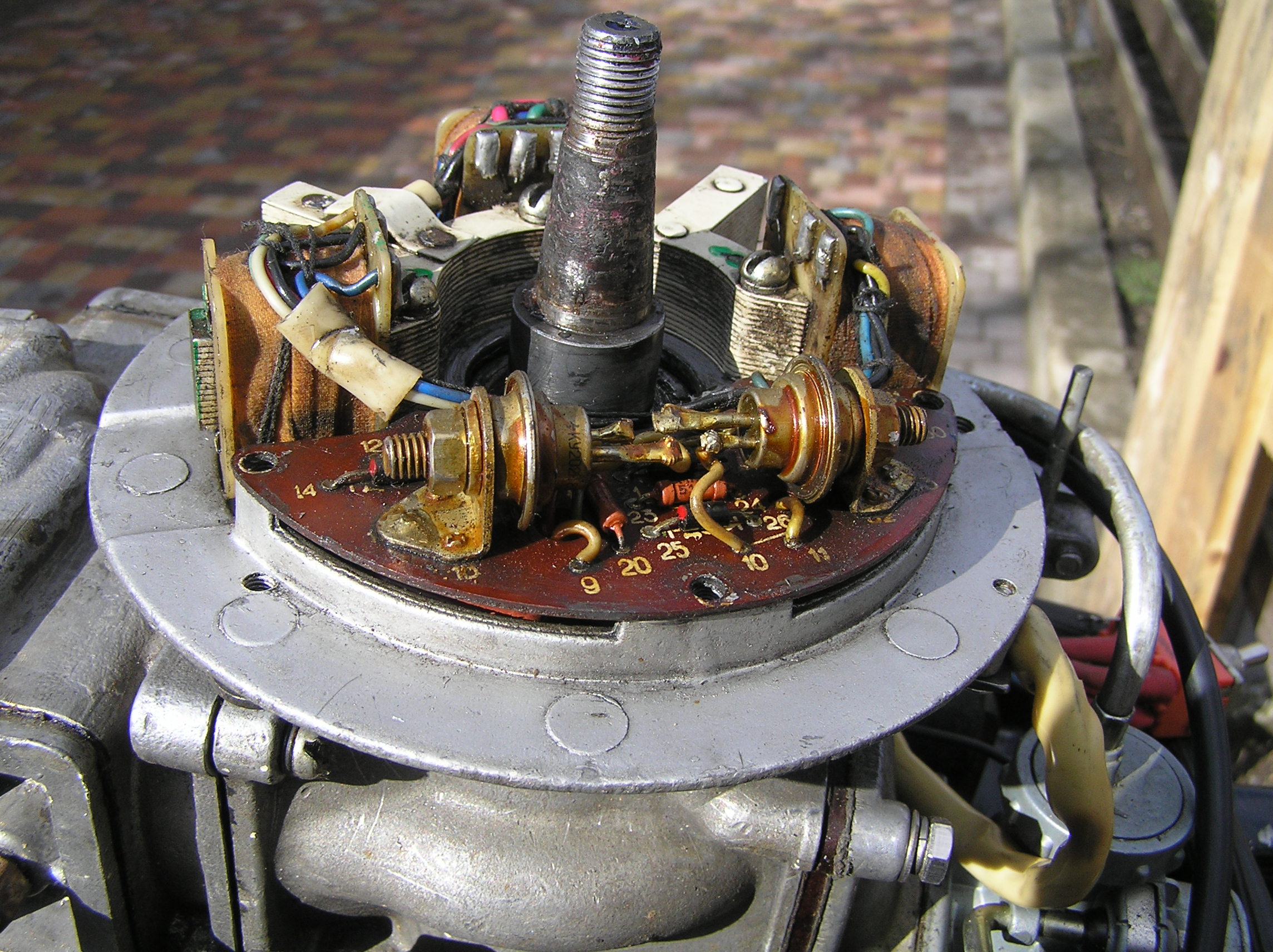 4. Мазните тонким слоем торцы магнитопровода на котором сидят катушки (их три торца) краской, лаком для ногтей, цапонлаком и т.п. Наденьте маховик, покрутите, снимите и посмотрите - не задевает ли он эти торцы (краска будет содрана).