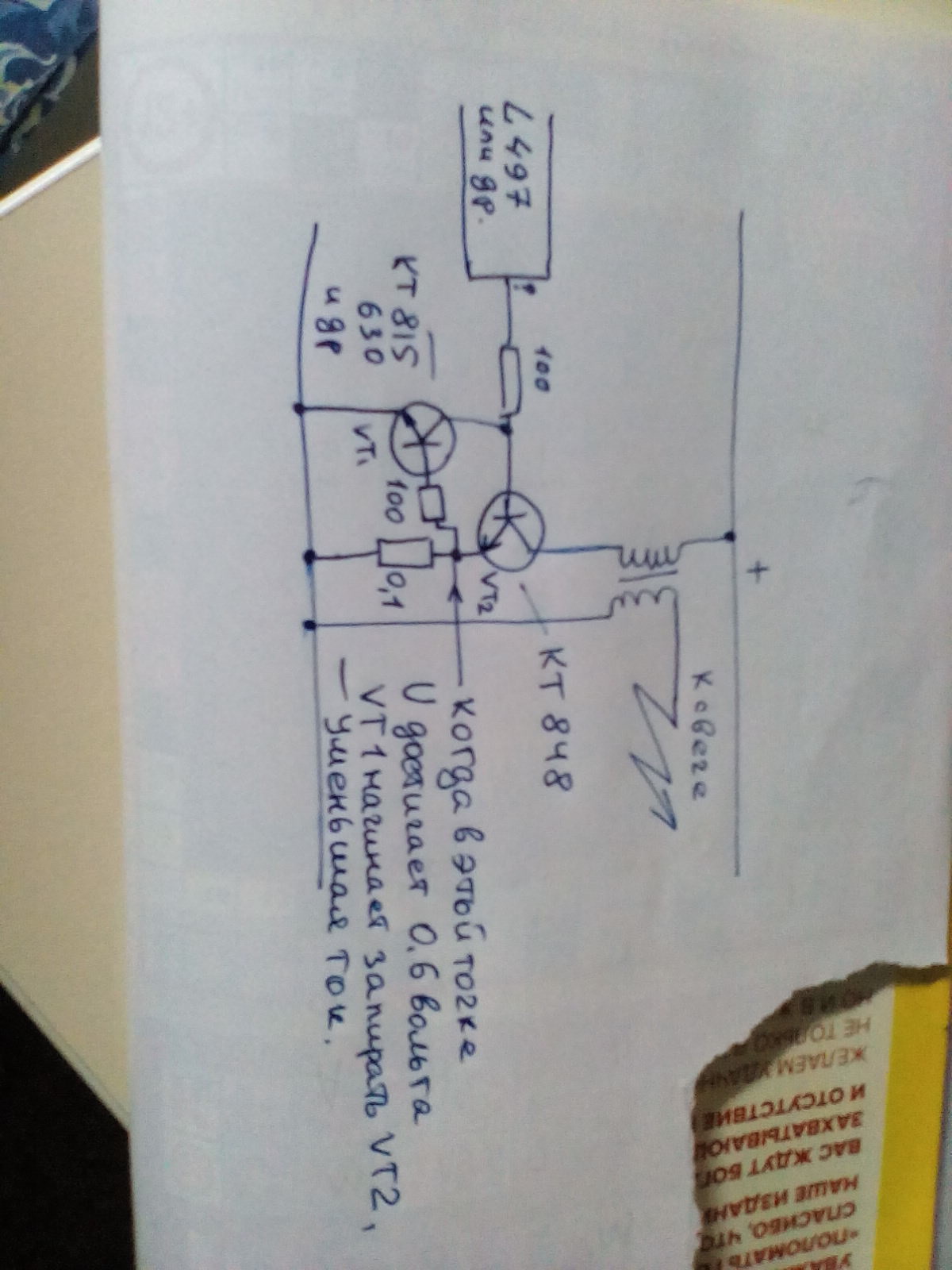 Кароче, у выходного транзистора, будь он КТ848, 872, 878, БУЗ 931,941, итд, в эмиттере всегда, независимо от схемотехники и фирмы, есть резистор, чаще от 0,68 до 0,1 ома, раньше он был мощный, 5 ватт, сейчас это может быть стопка СМДшных. С этого резистора, в простейшем случае, сигнал идет на базу какого нибудь КТ815, 630, который эмиттером подключен к минусу, а коллектором к базе мощного. Как только на резисторе появилось 0,6 вольта, а этого напряжения достаточно для отпирания маломощного биполярника, этот биполярник начинает подтягивать базу мощного к земле, прикрывая его, и уменьшая ток через катушку, но такая схема работает в линейном режиме, камень сильнее греется, хотя это все сжато во времени в пределах одного импульса, по этому можно забить.