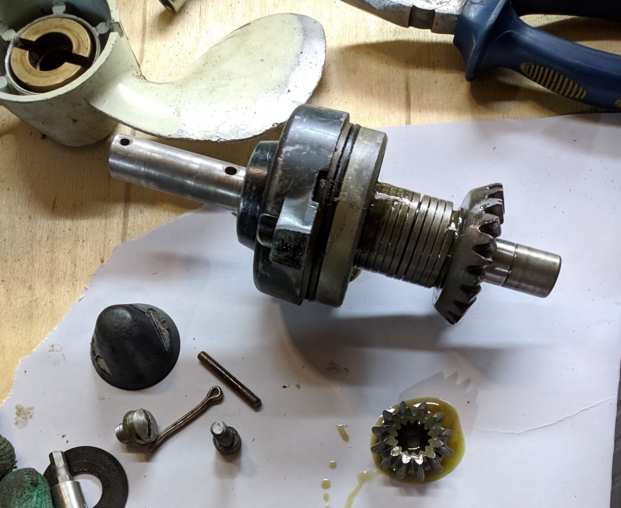 Вверху в дейдвуде трубка изношена была и выработала милиметра 3 в сторону отверстие. Внизу в помпу свободно вставляется, но там какое-то отверстие сбоку в трубке есть. Ничего переделывать не стал - только заглушил выработку в дейдвуде куском аллюминия , и немного снял файски , чтобы легче было попадать трубкой.