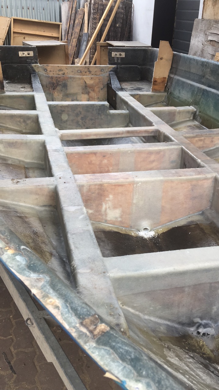 Панели пока пришлось отложить.пригнали лодку,пол немного провис в некоторых местах оказалось что между полом и нижними усилителями была пена которая со временем просела было принято решение разобрать на 2части и вот тут то ждал ещё один сюрпириз.усилители сделаны из березовой фанеры и обклеины стеклотканью, вода порождалась во внутрь и фанера начала гнить вместе с ней и разрушался пластик .сегодня вырезал что сгнило просверлили отверстия для вентиляции завтра постоит денёк просохнет внутри и будем восстанавливать предварительно все зашкурили.кто ни будь имел с такими вещами дело может есть какие то нюансы.? Всю внутреннюю часть потом думаю мастикой обработать от воды