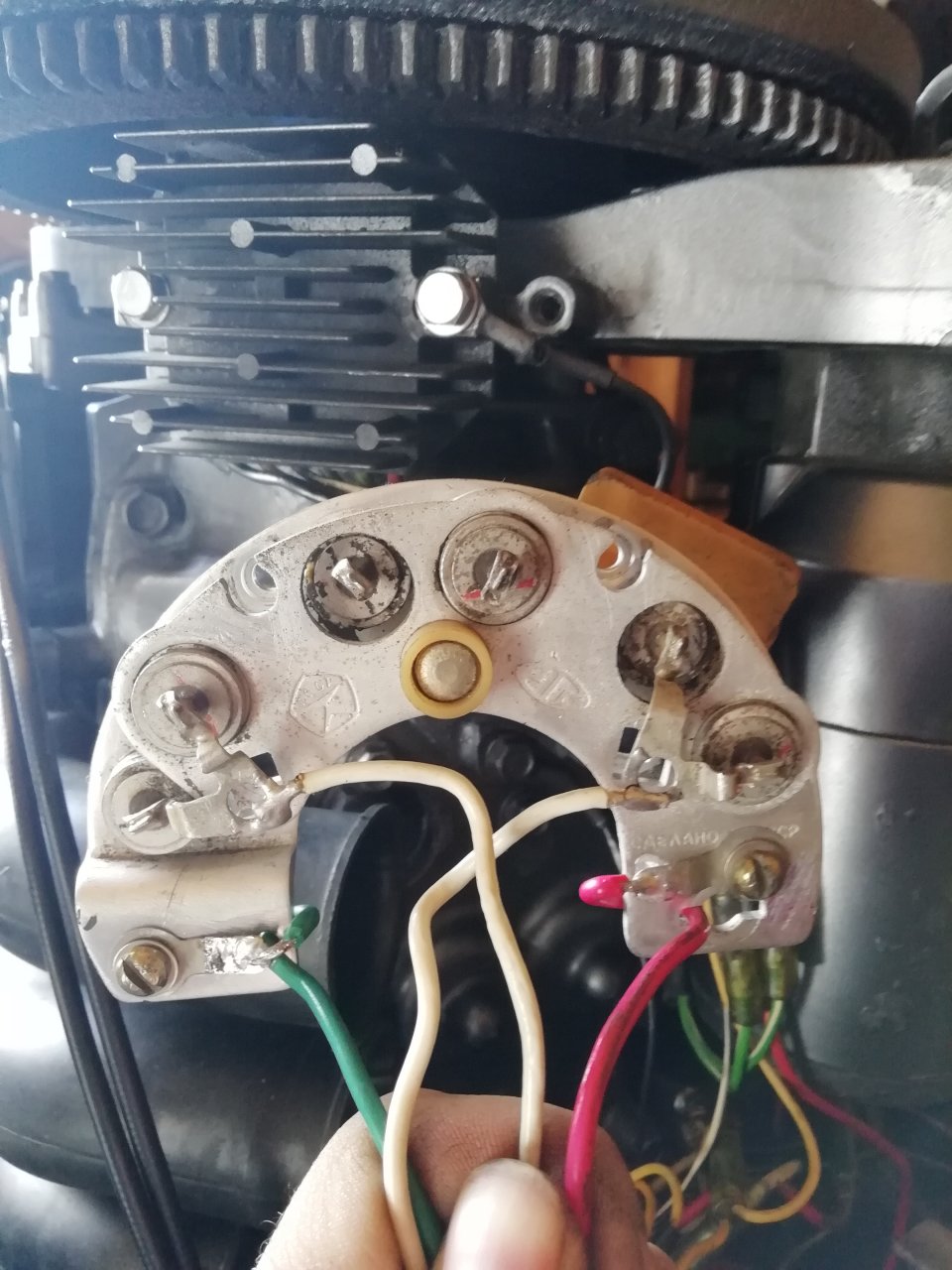 Да, родной не выдаёт напряжение вообще.такого типа мосты стоят в генераторах и имеют охлаждение принудительное от внутренних лопастей генератора.....у меня была проблемма на машине сгорел мост ... родной дорого... приколхозил такой же... все супер.. только он не влазил в корпус генератора... и сильно грелся .... пришлось его на длинных проводах вывести впереди радиатора чтоб на ходу обдувался.... ну все равно он со временем от нагрева распаялся (места пайки на диодах расплавились и раскрошились...) а на фото видно выпрямитель родной.... не работает? это который на 6 проводов?
