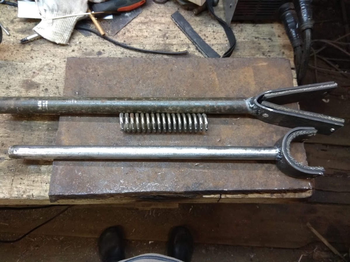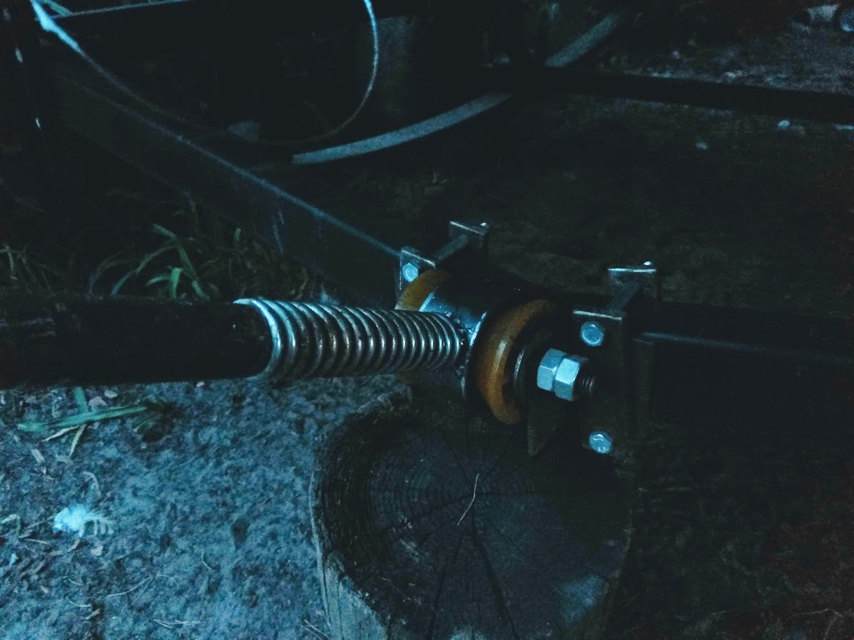 Внутри приклепаны вытяжными залепками полосы от транспортерной ленты. Пружина от заднего амортизатора мопеда "Верховина" (оказалась длинная и жесткая, буду менять).