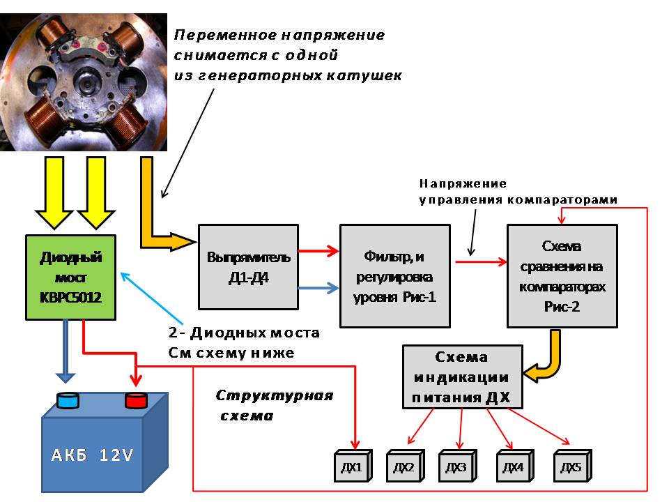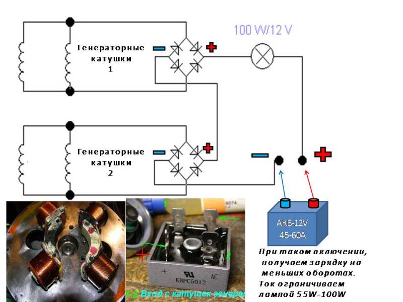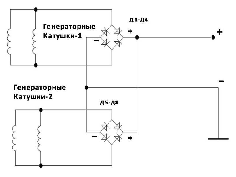 Смею вас огорчить, приведённая вами схема бессмысленна в нашем случае. "Реактивные токи" возникнуть в случае подключение индуктивной нагрузки (асинхронный двигатель, например), чего на моторной лодке я ещё не наблюдал. Вы привели схему двухполупериодного выпрямителя со средней точкой. Во-первых, нужна та самая средняя точка, чего нет в штатных катушках освещения магдино. Значит, катушки надо перематывать. Во-вторых, в этой схеме коэффициент использования катушек 50%, значит ток будет меньше вдвое.