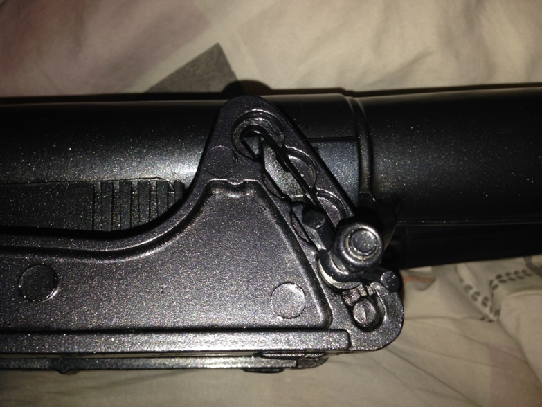 4. Дифферентовка. Вообще непонятно как делать. В инструкции написано - вытащите прут угла дифферента из кронштейна и переставьте в другое отверстие (фото "Прут угла дифферента_1"). Но у меня не получается полностью вытащить прут, только свободный ход в отверстии делает. И еще держатель (выделен красным на фото "Прут угла дифферента_2") опускается на сантиметр вниз на "ноге" мотора.
