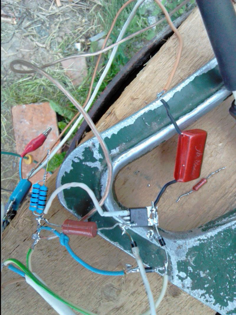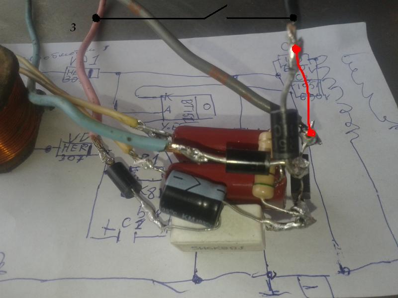 Теперь делаю так как Вы подсказали ,припаяваю з средней ноги теристора диод к левой ноге теристора тоесть по схеме катод ,к ниму припаеваю чорый провод , и у мене в той точке припаян серый провод серый то куда подлючить или он там не нужен ? . Если я правильно понял то ето будет маса .Синей припаян к диоду и к средней ноге тыристора уходет на точку 1 начало катухи .