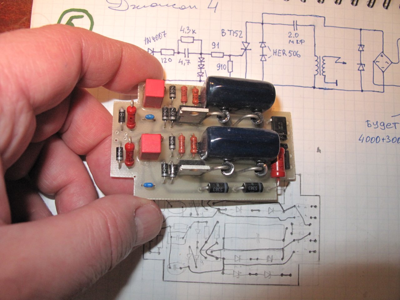 Один не дачёт в этой компоновке. Тиристор стоит вертикально. Но это первые варианты плат. Во всех остальных..он лежит и прикручен к гетинаксу. А резисторы стоят спаренные по три штуки 2w( там где надо 5W ). А пропитка в несколько слоёв, надёжно держит все компоненты. Ни разу не отвалились. И вибрация на моторе в основном осевая. А все детали(крепления, ну выводы радиодеталей) стоят перпендикулярно этой вибрации. А сами детали параллельно Вот если на оборот, то создавало бы проблему.