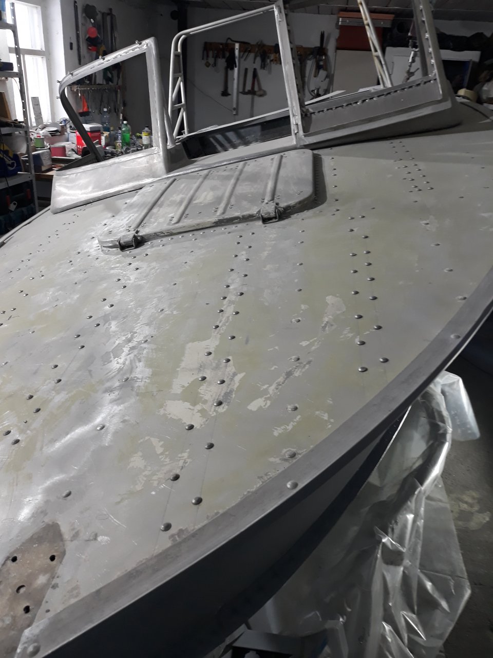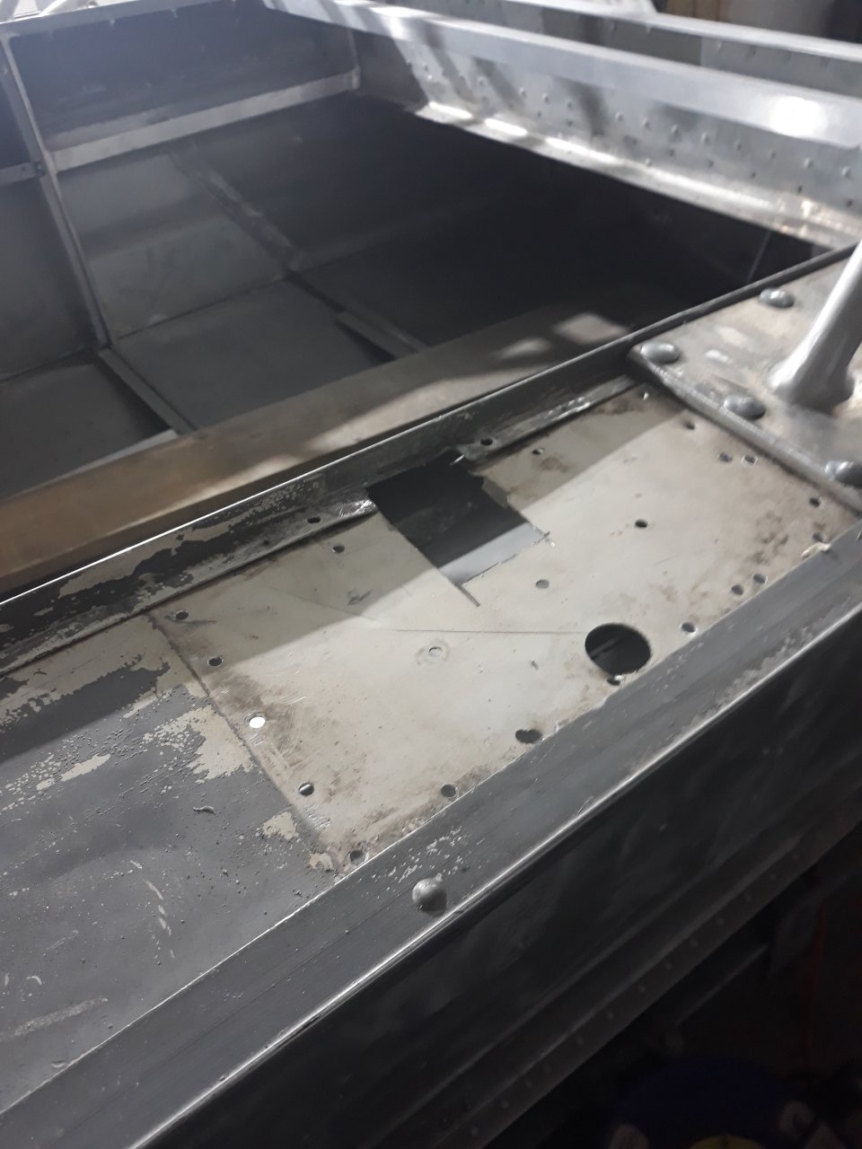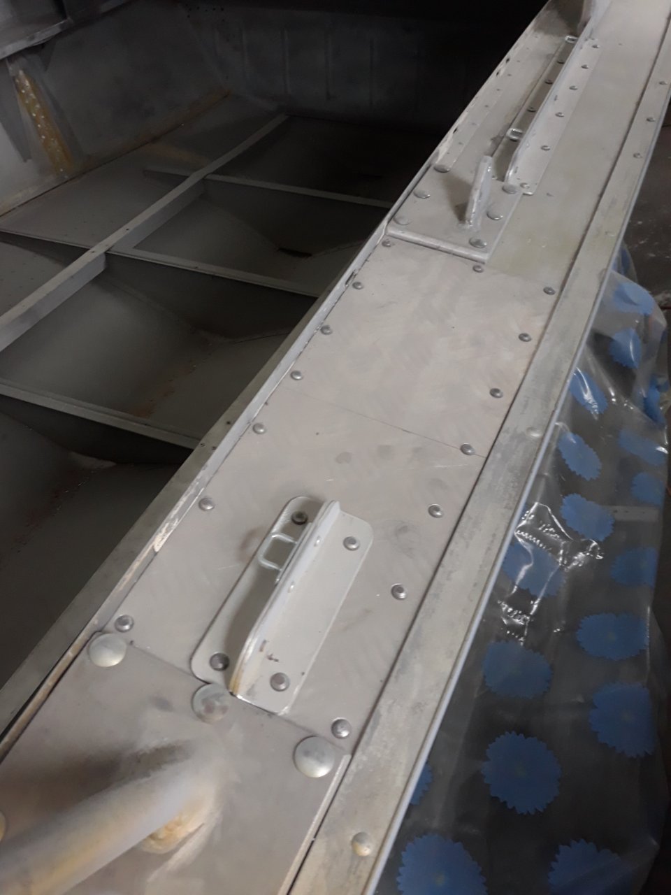 Борис спасибо все так и сделал, + пришлоси два тавра приклепать чтобы дюраль не играла, ну и небольшой отчет, палубу усилил таврами изнутри, все на полнотелые, низ покрасил пока не тяжелая, приходилось поднимать по очереди бока, неудобно, но другого варианта нет.