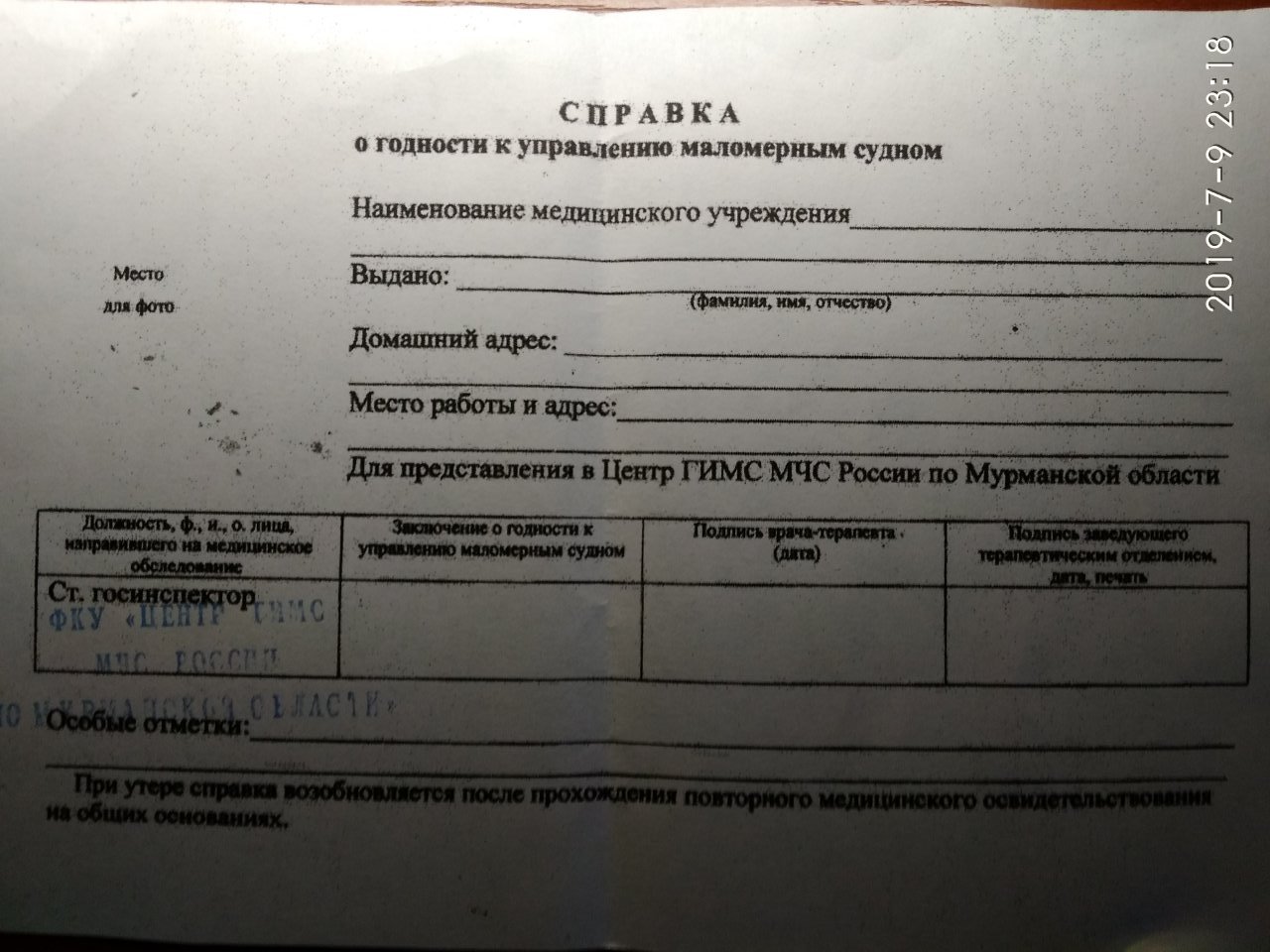 - МЕДИЦИНСКУЮ СПРАВКУ О ГОДНОСТИ К УПРАВЛЕНИЮ МАЛОМЕРНЫМ СУДНОМ или МЕДИЦИНСКОЕ ЗАКЛЮЧЕНИЕ о наличии (об отсутствии) у водителей транспортных средств (кандидатов в водители транспортных средств) медицинских противопоказаний, медицинских показаний или медицинских ограничений к управлению транспортными средствами (действует в течение 12 месяцев с даты выдачи);