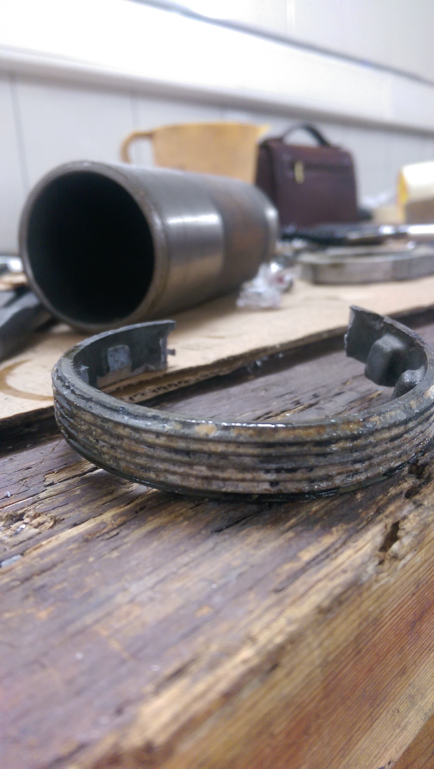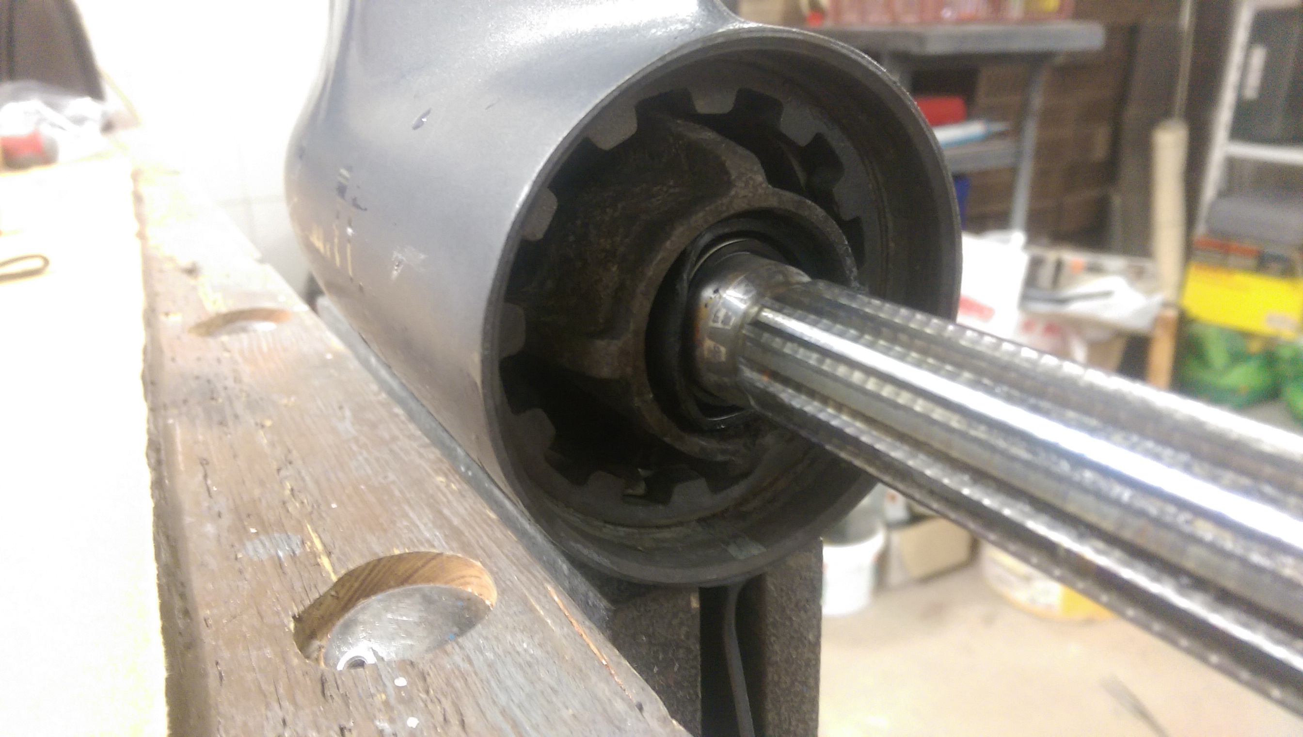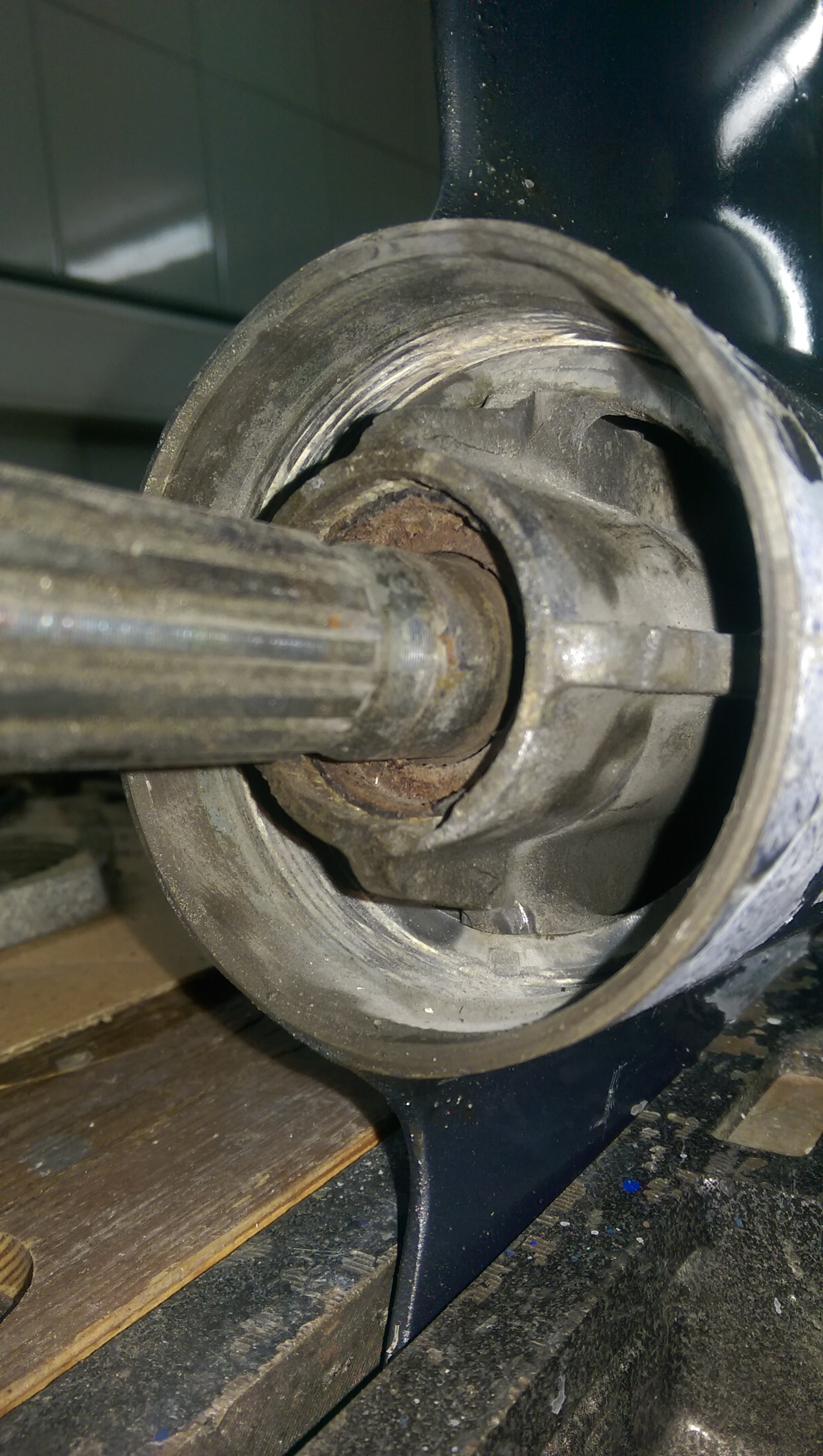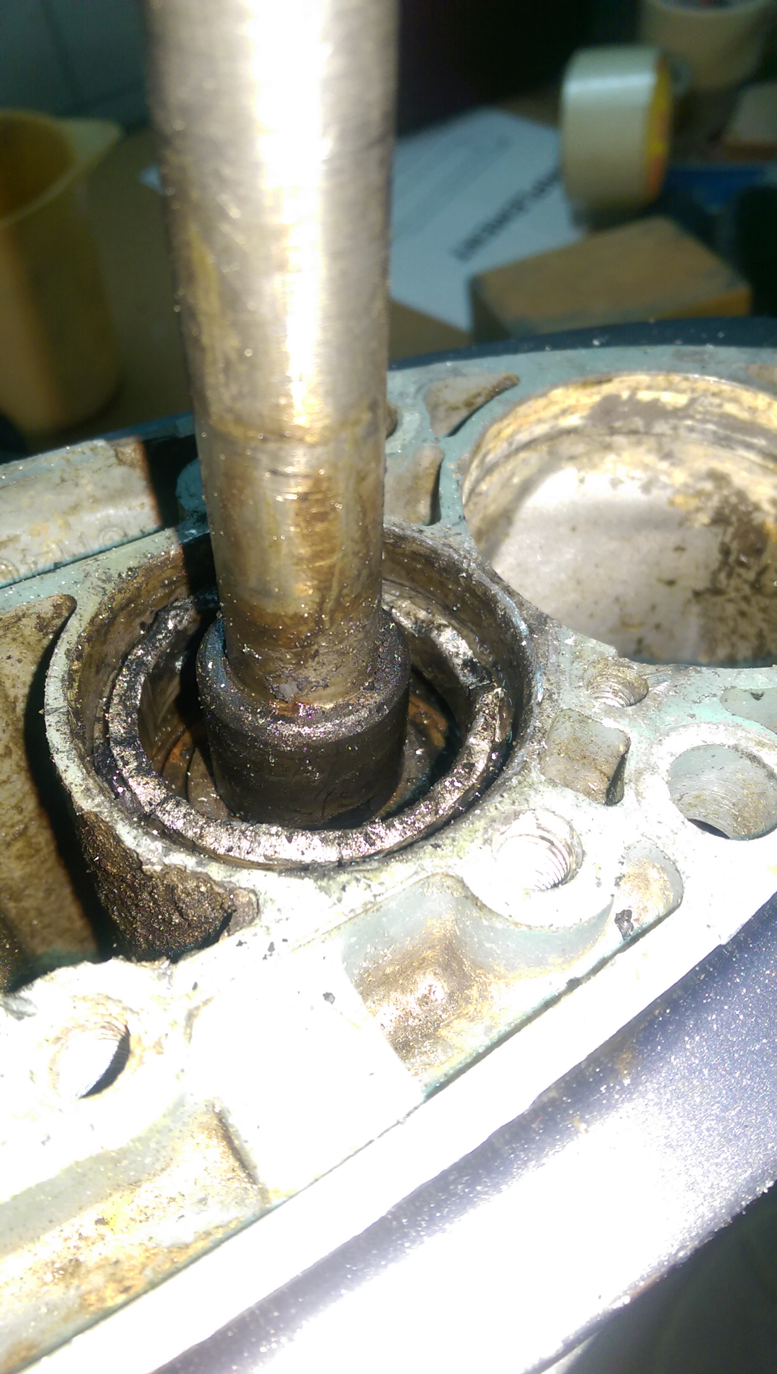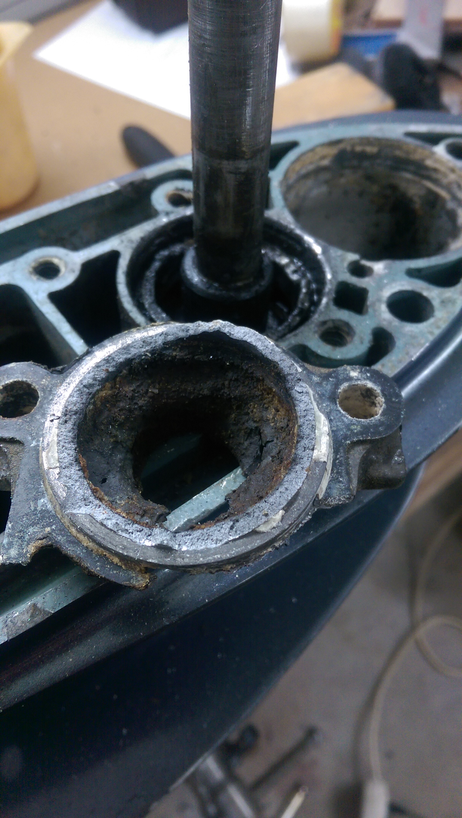 Начал со снятия редуктора. Несмотря на то, что мотор из соленой воды, все нормально откручивается, что немного озадачило. Снятие корпуса редуктора показало, что туда уже лазили. Пятый болт, что под анодом, отломан, судя по всему уже давно. Первый вопрос: насколько он критичен? Теоретически можно заморочиться и попытаться извлечь часть с резьбой из корпуса, но нужно ли это делать?
